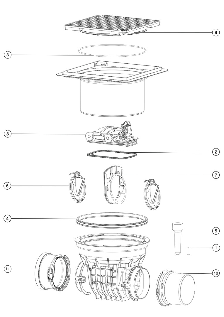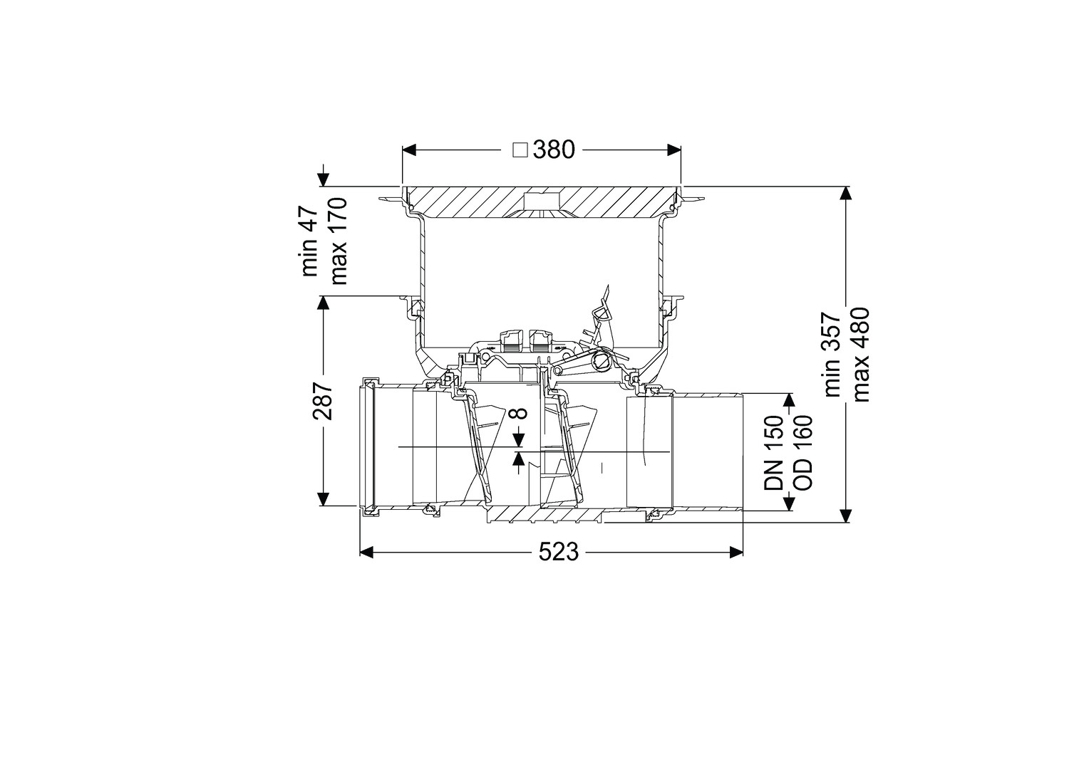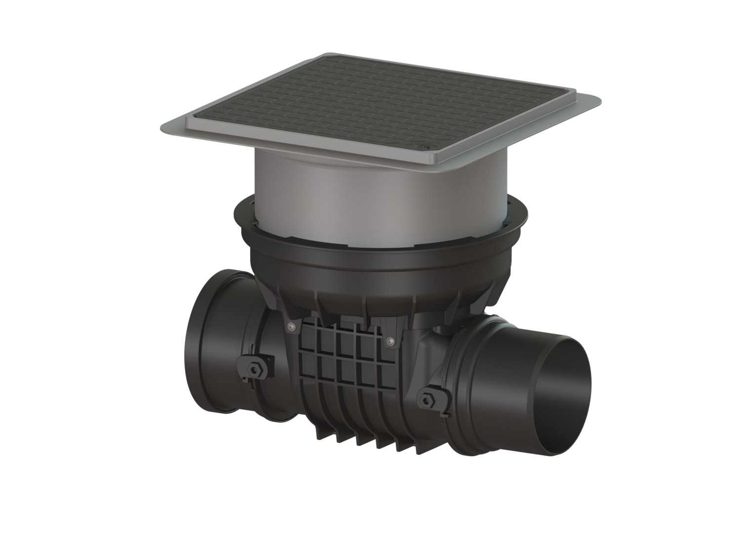 mit 2 Kunststoffklappen, Einbau in die Bodenplatte, teleskopischem Aufsatzstück und Flansch für Abdichtung im Verbund, Einbautiefe DN 90-100 276-399 mm, Einbautiefe DN 125-200 328-450 mm, Aussparungsmaße 750 x 750 mm, Zu-/Auslauf DN 200 Hydraulik entspricht DN 150