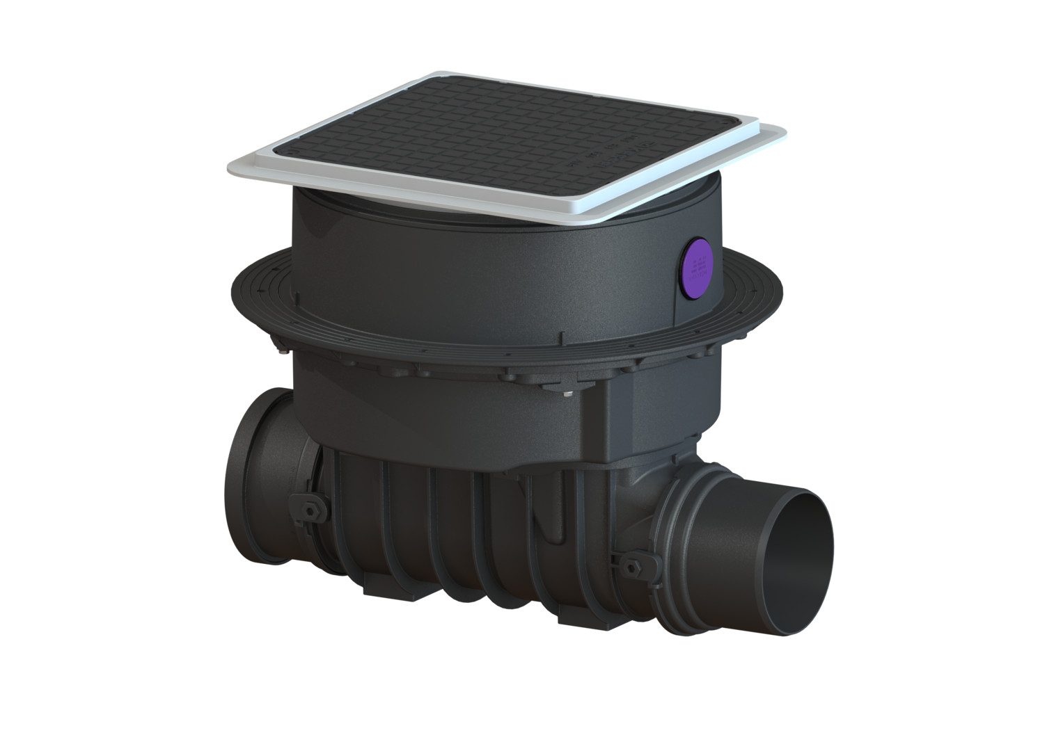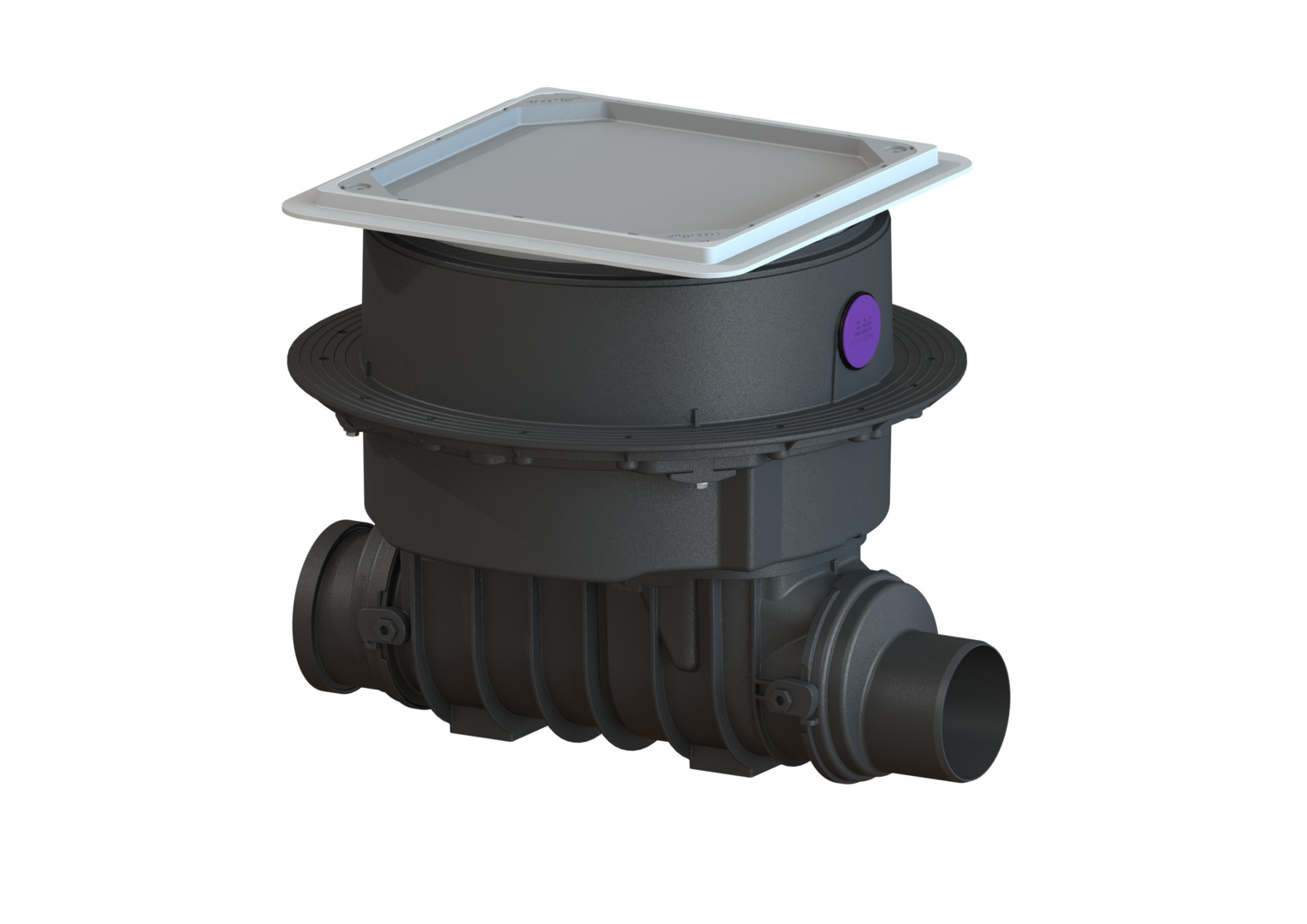 mit Zu-/Auslaufstutzen, teleskopisches Aufsatzstück und Flansch für Abdichtung im Verbund, Abdeckung befliesbar oder schwarz, Einbautiefe 516-669 mm, Aussparungsmaße 750 x 750 mm, Einbau in die Bodenplatte, Zu-/Auslauf DN 200 Hydraulik entspricht DN 150