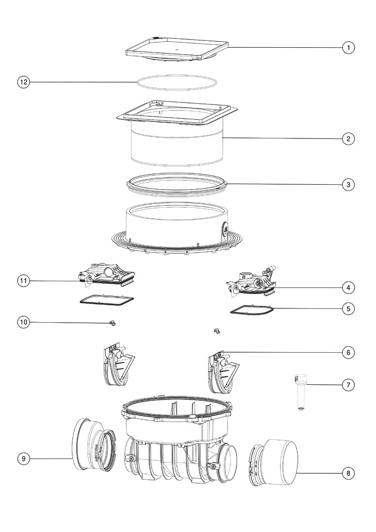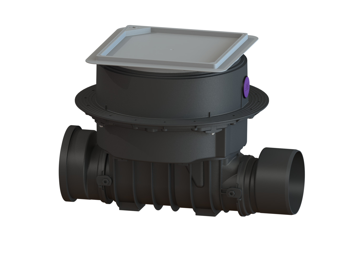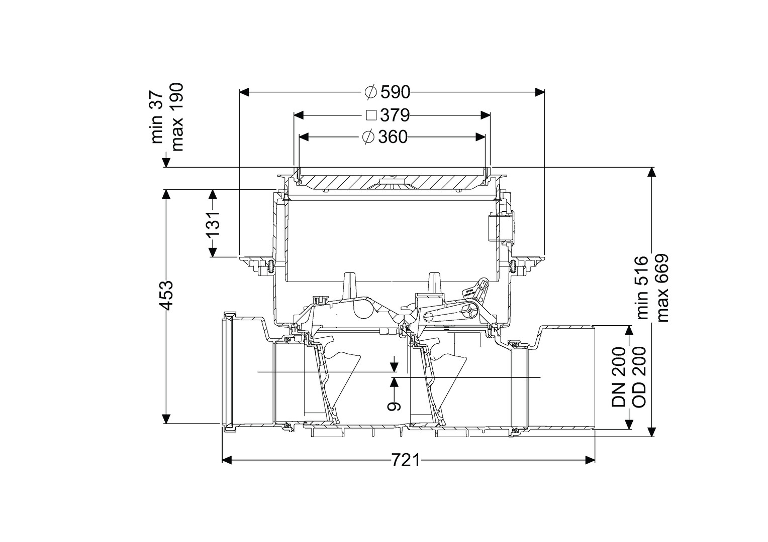 mit Zu-/Auslaufstutzen, teleskopisches Aufsatzstück und Flansch für Abdichtung im Verbund, Abdeckung befliesbar oder schwarz, Einbautiefe 516-669 mm, Aussparungsmaße 750 x 750 mm, Einbau in die Bodenplatte, Zu-/Auslauf DN 200 Hydraulik entspricht DN 150