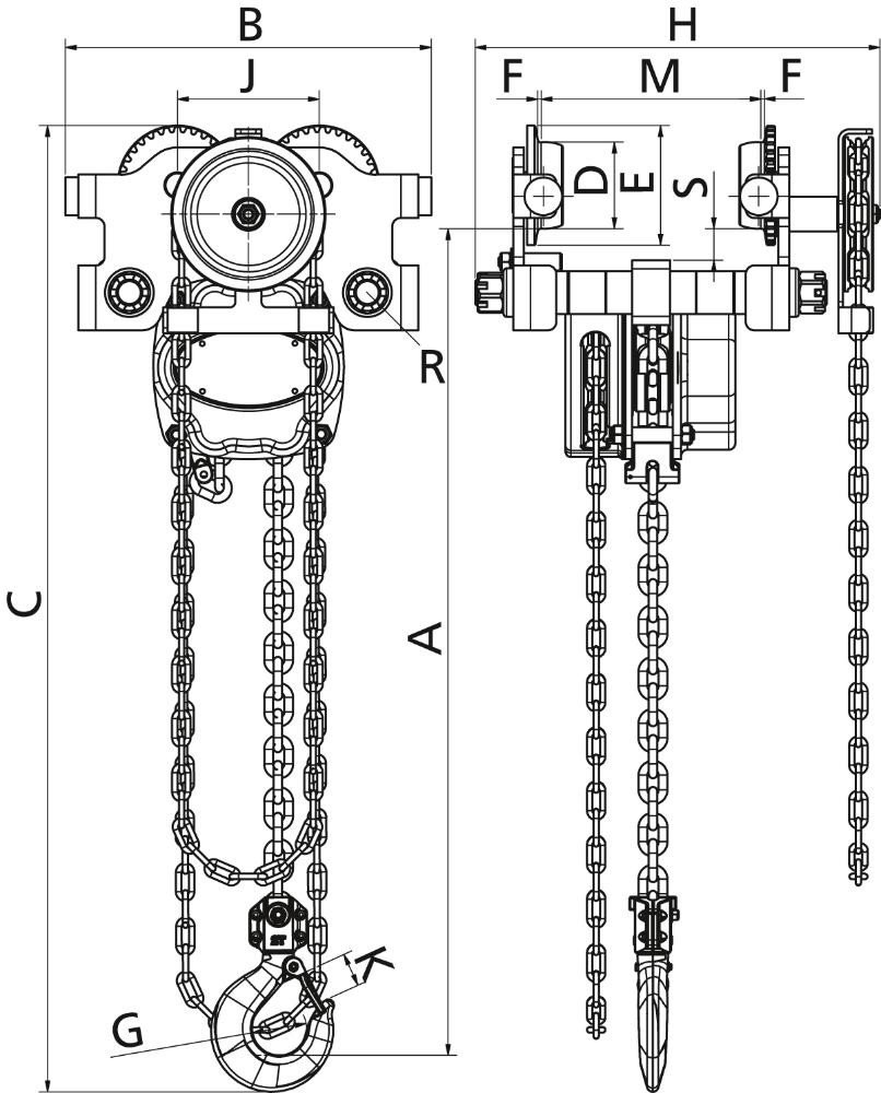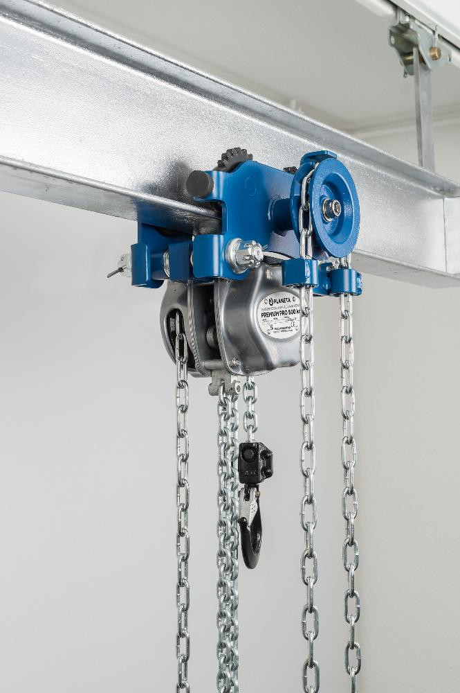 Hinweis: Diese Kombination aus Flaschenzug und Fahrwerk mit niedriger Bauhöhe wird immer dort eingesetzt, wo es auf optimale Raumnutzung ankommt.