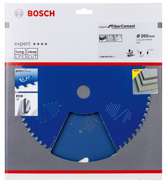 Das Expert for Fibre Cement Kreissägeblatt ist sehr robust beim Schneiden von Faserzement. Es verfügt über PCD-Zähne (Polykristalliner Diamant), wodurch eine extrem hohe Lebensdauer sichergestellt wird. Die Leistung wird durch die Schutzbeschichtung ProteQtion gefördert. Sie verhindert Korrosion, ermöglicht zuverlässiges Schneiden und reduziert dabei Reibung. Das Produkt ist mit Dämpfungsschlitzen für einen besonders ruhigen Lauf, deutlich weniger Geräusche und spürbar geringere Vibration ausgestattet. Das Expert for Fibre Cement Kreissägeblatt verfügt über TCG-Zähne (Triple Chip Grind) für höchste Robustheit und eine lange Lebensdauer.