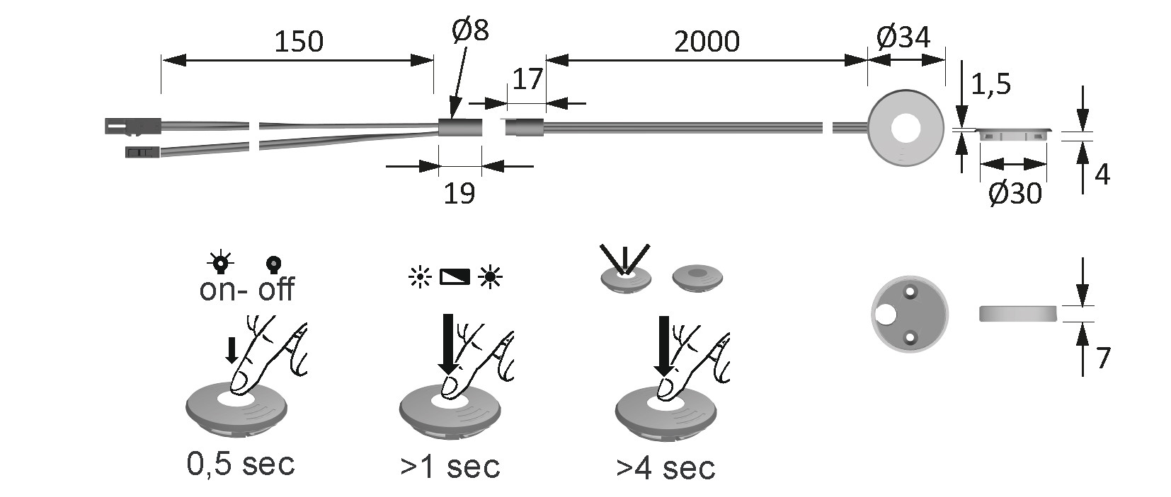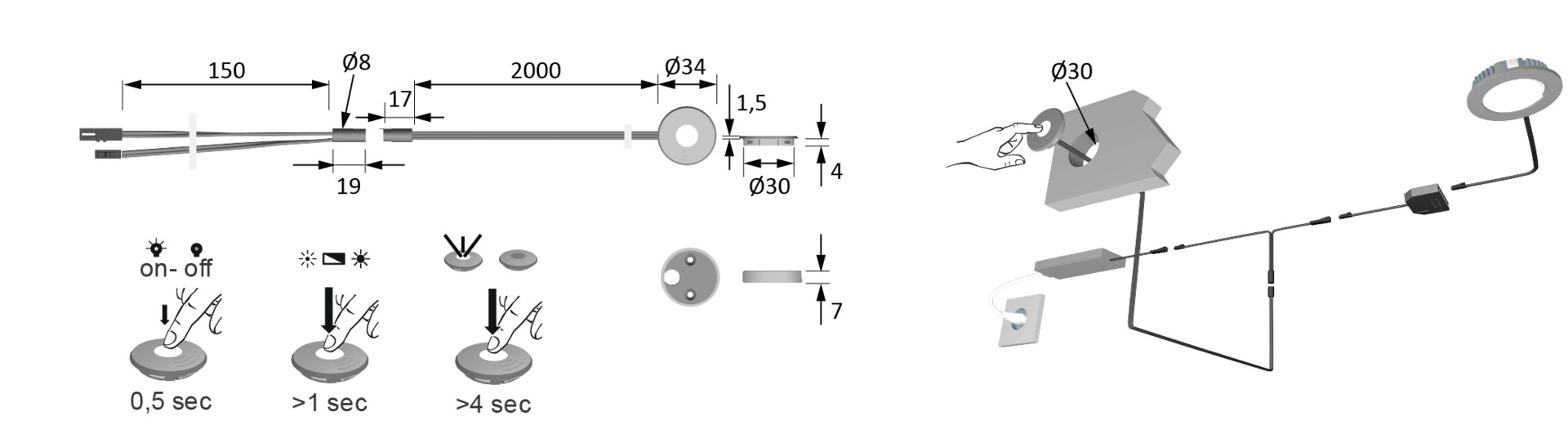 FORMAT Dimmer LED Touch; Spannung: 12 V; Einsatzbereich: LED-Leuchten; Standby (Leistung): 0,5 W; Schaltleitung (Länge): 2.000 mm; Höhe Schalter: 7 mm; Basis: Dimmer; Zuleitung: 2.000 mm; Schaltleistung max.: 36 W