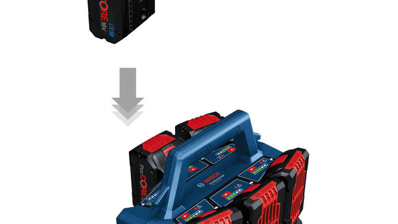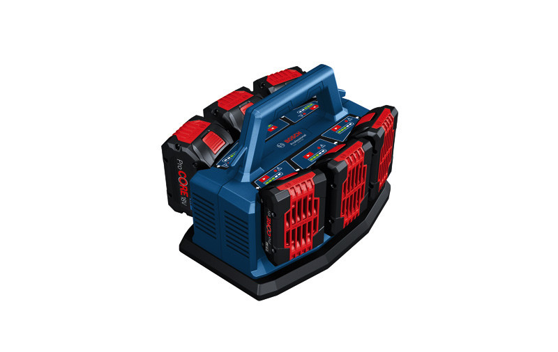 Ladegerät GAL 18V6-80, Mit dem GAL 18V6-80 ist ein kontinuierliches Laden in zwei Zyklen während der Arbeit oder über Nacht möglich. Im ersten Zyklus werden nacheinander bis zu sechs Akkus bis zu 80 % geladen. Im zweiten Zyklus wird der Ladevorgang abgeschlossen, und alle Akkus werden bis zu 100 % geladen. Dank eines Ladestroms von 8 A werden ProCORE18V 8.0Ah-Akkus in nur 42 Minuten bis zu 80 % geladen. Ladezustandsanzeigen mit 5 LEDs an jeder Ladeschnittstelle zeigen den genauen Fortschritt beim Laden an. Mit einer Prioritätsstarttaste für jede Schnittstelle kann der Zyklus unterbrochen werden, um unmittelbar mit dem Laden des ausgewählten Akkus beginnen zu können. Kompatibel mit allen Bosch Professional 18V-Akkus (Professional 18V System). Durch Befestigen des mit mehreren Fächern ausgestatteten Ladegeräts an einer L-BOXX können potenziell schädliche Bewegungen beim Transport vermieden werden. Der Griff des Ladegeräts ist mit Haken ausgestattet, über die das Kabel zur Lagerung und zum sicheren Transport sauber aufgewickelt werden kann. Karton. L-BOXX-Adapter für GAL 18V6-80