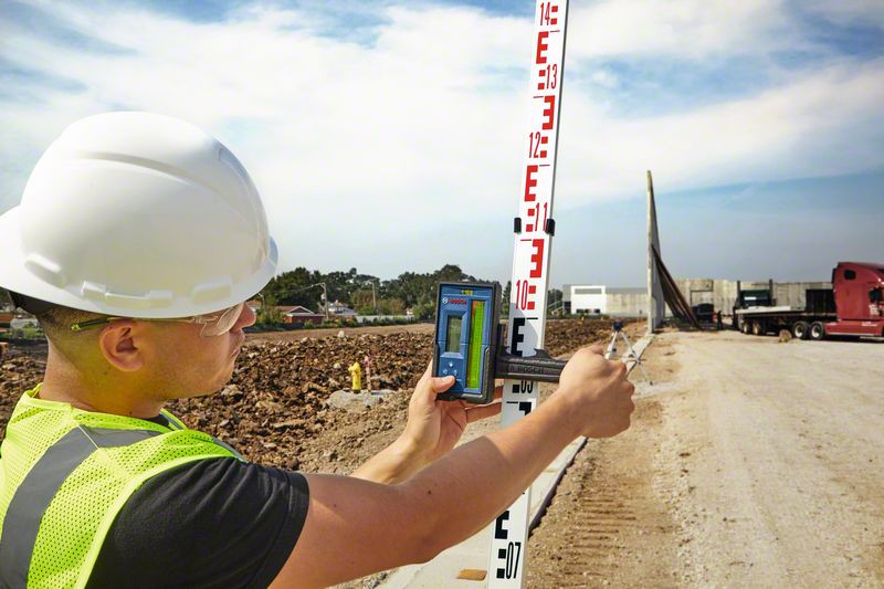 Laser-Empfänger LR 45. Der robuste Laserempfänger LR 45 Professional ermöglicht eine unkomplizierte Erfassung von grünen und roten Laserstrahlen. Der große Empfangsbereich des Geräts und sein doppelseitiges Display mit Hintergrundbeleuchtung und Offset-Funktion in Millimetern gewährleisten eine problemlose Lasererfassung. Das Gerät ist auch auf anspruchsvollen Baustellen immer einsatzbereit: ein ergonomischer Softgriff und Schutzklasse IP 66 gegen Staub und Spritzwasser sind ideal, um rauen Bedingungen standzuhalten. Sechs verschiedene Empfindlichkeitseinstellungen und drei Lautstärkeeinstellungen (inkl. Aus) bieten die notwendige Flexibilität für eine einfache Anpassung an jede Baustelle. Der LR 45 Professional eignet sich sowohl für die Verwendung im Innen- als auch im Außenbereich und ist somit der ideale Helfer bei verschiedensten Arbeiten wie Aushub, Landschaftsbau, Fassadenarbeiten, Betonieren, Heizungs-/Klimainstallation und vieles mehr. Der LR 45 Professional bietet eine große Arbeitsreichweite von bis zu 300 m. Die integrierte Wasserwaage vereinfacht zusätzlich jede Nivellieraufgabe.