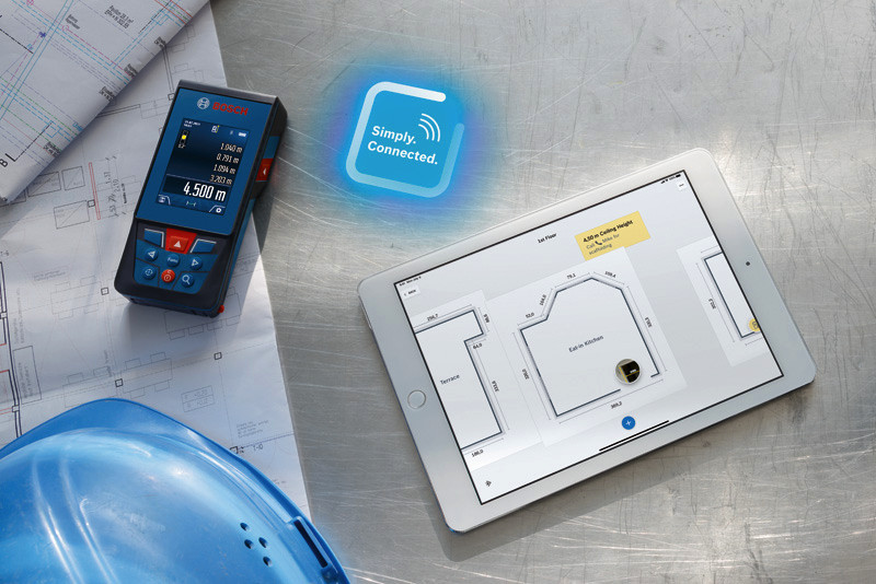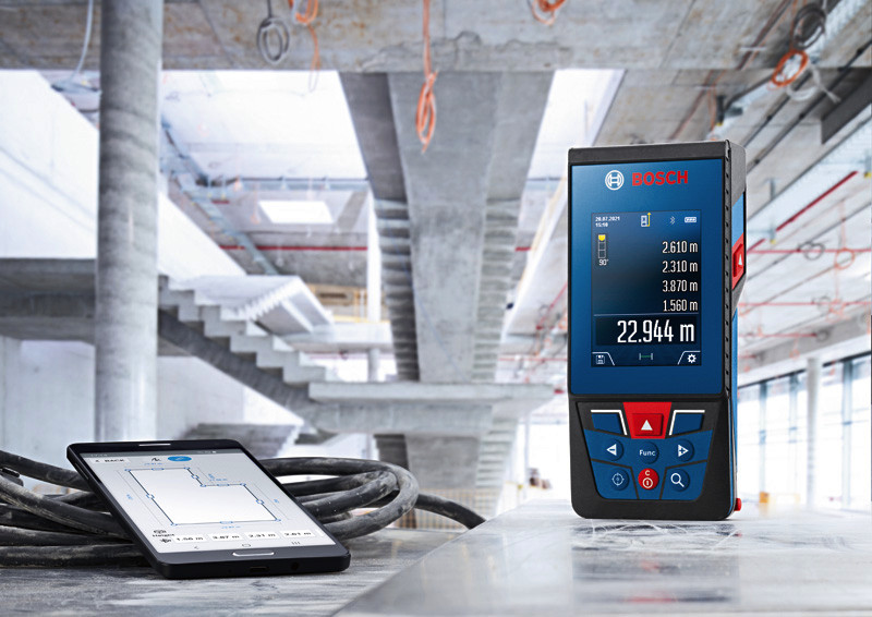 Laser-Entfernungsmesser GLM 100-25 C, Dieser professionelle Laser-Entfernungsmesser für den Außenbereich verfügt über eine digitale Kamera-Zieloptik mit Zoomfunktion, die Entfernungen bis 100 m präzise misst. Das Kamerabild und die Messwerte sind gut sichtbar auf dem großen, kontrastreichen 2,8-Zoll-IPS-Farbdisplay, das zwischen Hoch- und Querformat wechselt. Für eine bequeme Dokumentation können Messergebnisse per Bluetooth an die Bosch MeasureOn App übertragen werden. Dieser Laser-Entfernungsmesser ist die ideale Lösung für raue Baustellen dank IP54-Schutz gegen Staub und Wasser und kratzfestem Displayglas. Architekten, Bauleiter und Elektriker werden die Eignung für den Außenbereich, die gute Ablesbarkeit und die bequeme Dokumentation dieses robusten Laser-Entfernungsmessers zu schätzen wissen. Der GLM 100-25 C Professional besitzt eine benutzerfreundliche Bedienoberfläche mit Klickrad für den Zugang zu allen Funktionen. Eine nützliche Hilfefunktion zeigt detaillierte Bilder jeder Messfunktion für eine leichte Verständlichkeit. Schutztasche. Trageschlaufe. 3 x 1,5 V-LR6-Batterie (AA)