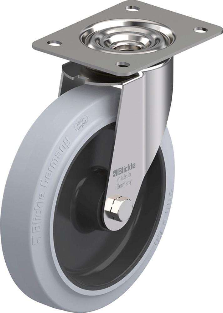 • Lauffläche: Elastik-Vollgummireifen Blickle EasyRoll, 65 Shore A, Farbe grau, spurlos und leichtlaufend