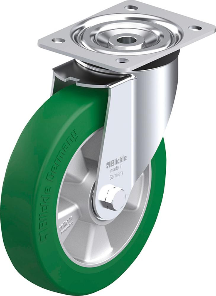 • Lauffläche: Polyurethan-Elastomer Blickle Softhane® 75 Shore A, Farbe grün, spurlos und kontaktverfärbungsfrei