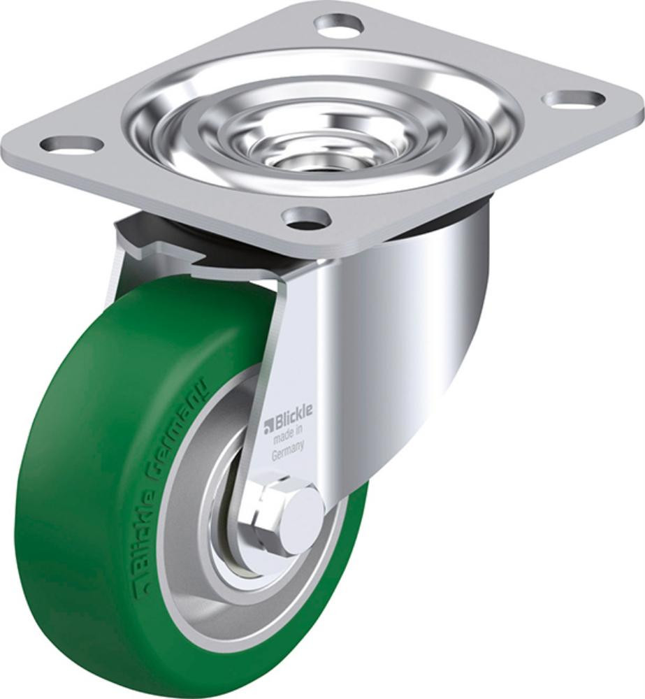 • Lauffläche: Polyurethan-Elastomer Blickle Softhane® 75 Shore A, Farbe grün, spurlos und kontaktverfärbungsfrei