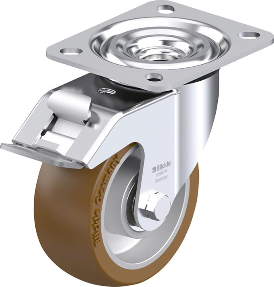• Lauffläche: Polyurethan-Elastomer Blickle Besthane® 92 Shore A, Farbe braun, spurlos und kontaktverfärbungsfrei