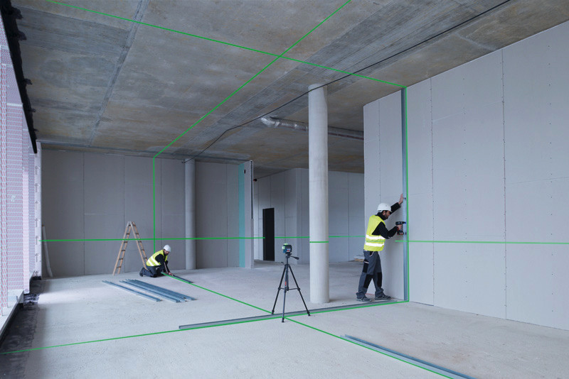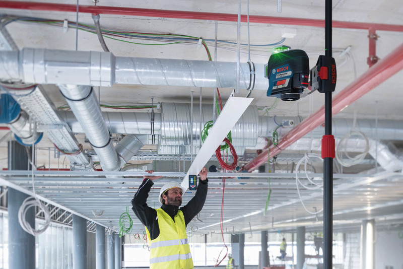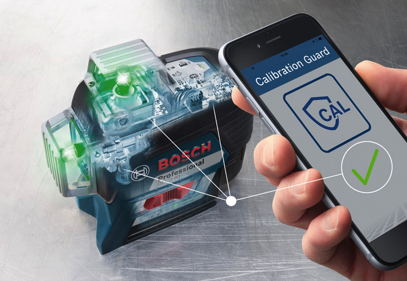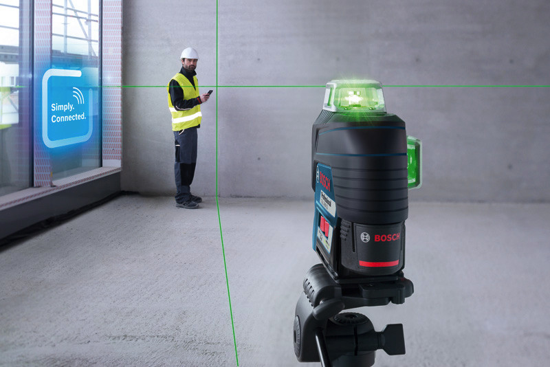 Linienlaser GLL 3-80 CG, Der Linienlaser GLL 3-80 CG Professional wird einfach angeschlossen und sorgt über die deutliche Projektion von 3 x 360°-Linien für exzellente Sichtbarkeit. Helle grüne Laserlinien bieten bis zu vierfach bessere Sichtbarkeit als rote Linien. Dank innovativer CAL Guard-Überwachung und Bluetooth®-Verbindung zur Smartphone-App sind der ferngesteuerte Einsatz, die kontaktlose Justierung sowie hohe Präzision möglich. Dank der von diesem Gerät emittierten 3 x 360°-Linien ist ein gleichzeitiges horizontales und vertikales Nivellieren und somit hohe Arbeitseffizienz möglich. Dieser Linienlaser wurde für den Bau von Böden, die Montage von Fenstern, das Anbringen von Regalen, den Rohbau für Trockenbauwände und das Verlegen von Fliesen entwickelt. Dank Dual Power Source-Technologie des GLL 3-80 CG Professional ist ein Betrieb sowohl mit 12-V-Li-Ion-Akku als auch mit Standard-Alkalinebatterien möglich, ein Plus an Flexibilität. Das Gerät ist in der Lage, sich auf nicht planaren Oberflächen in weniger als 4 Sekunden mit einer exzellenten Genauigkeit von ± 0,2 mm/m*/** um bis zu +/- 4° selbst zu nivellieren und verfügt bei Verwendung des optionalen Empfängers LR 7 Professional über eine Reichweite von bis zu 120 m. Dieser Linienlaser ist kompakt, einfach zu bedienen und extrem robust (IP54***). L-BOXX 136 (1 600 A01 2G0). Universalhalterung BM 1 Professional (0 601 015 A01). Laserzieltafel. Tasche. 1 x Akku GBA 12V 2.0Ah (1 600 Z00 02X). Schnellladegerät GAL 12V-40 Professional (1 600 A01 9R3)