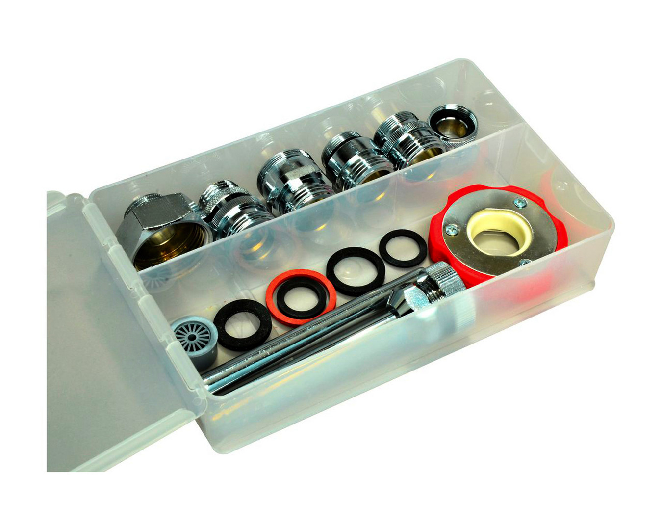 bestehend aus 1 Anschluss-Reduzierung 1“ IG x 1/2“ AG, 1 Anschluss-Reduzierung 3/4“ IG x 1/2“ AG, 1 Anschluss-Reduzierung M 28 x 1 AG x 3/4“ AG, 1 Anschluss-Reduzierung M 24 x 1 AG x 3/4“ AG, 1 Anschluss-Reduzierung M 22 x 1 AG x 3/4“ AG, 1 Anschluss-Reduzierung M 22 x 1 IG x 3/4“ AG, 1 Anschluss-Reduzierung M 22 x 1 AG x 1/2“ AG, 1 Anschluss-Reduzierung M 22 x 1 IG x 1/2“ AG, 2 Anschluss-Rohr 10 mm verchromt, Länge 11 cm, 1 Quetschverschraubung 1/2“ x 10 mm, 1 Service-Schlüssel