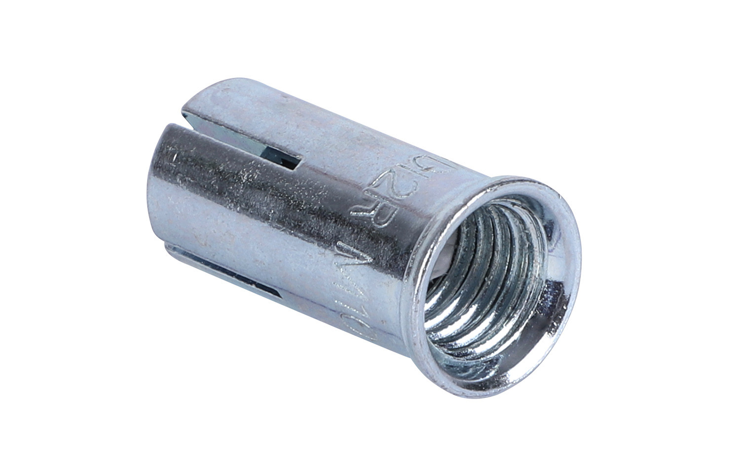 Mit einem Kragen zum oberflächenbündigen Setzen befestigt der WDI2R Einschlaganker kurz gelippt M8 x 25 mm (ev) mittlere Lasten in gerissenem und ungerissenem Beton, durch reduzierte Setztiefe von 25 mm auch zugelassen in Spannbeton-Hohldeckenplatten.
