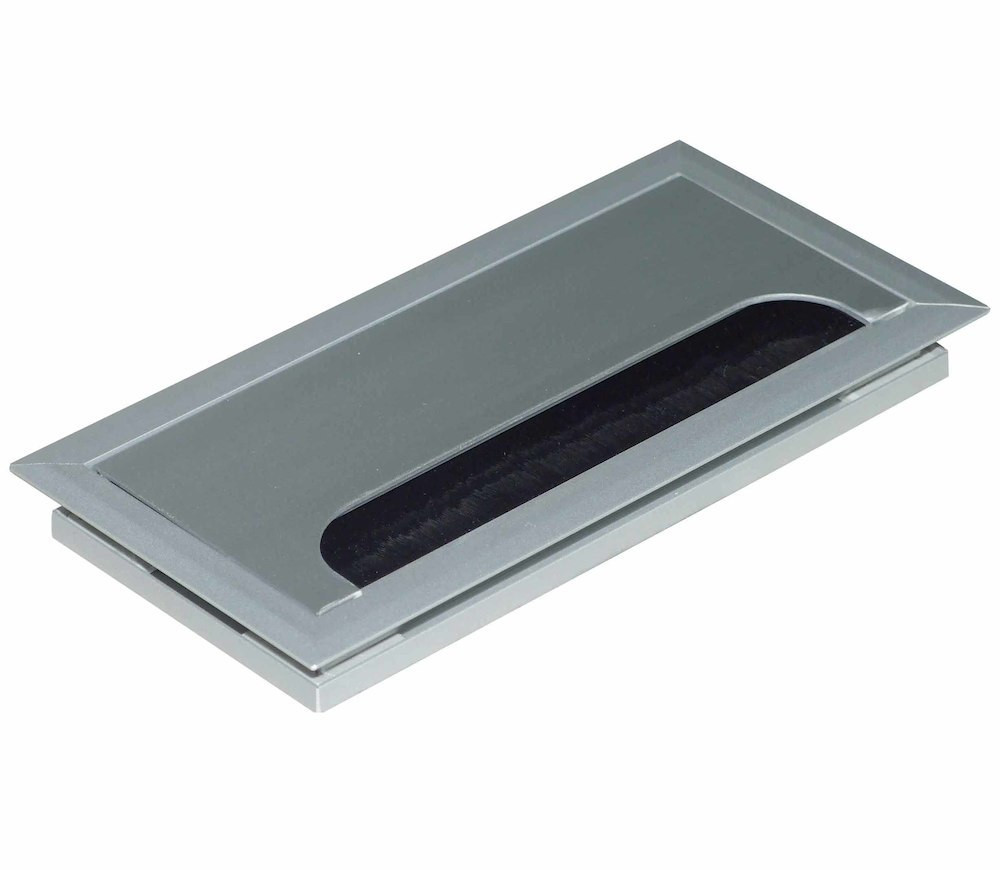 FORMAT Kabeldurchlass; Form: eckig; Werkstoff: Aluminium; Ausführung: Klappe + Bürstendichtung; Einsatzbereich: Möbel; Breite: 80 mm; Länge: 240 mm; Höhe: 15,6 mm; Oberfläche: eloxiert; Länge (Ausschnitt): 232 mm; Breite (Ausschnitt): 72 mm; Basis: Kabeldurchlass; Eckenradius: 2 mm; Farbton: silber