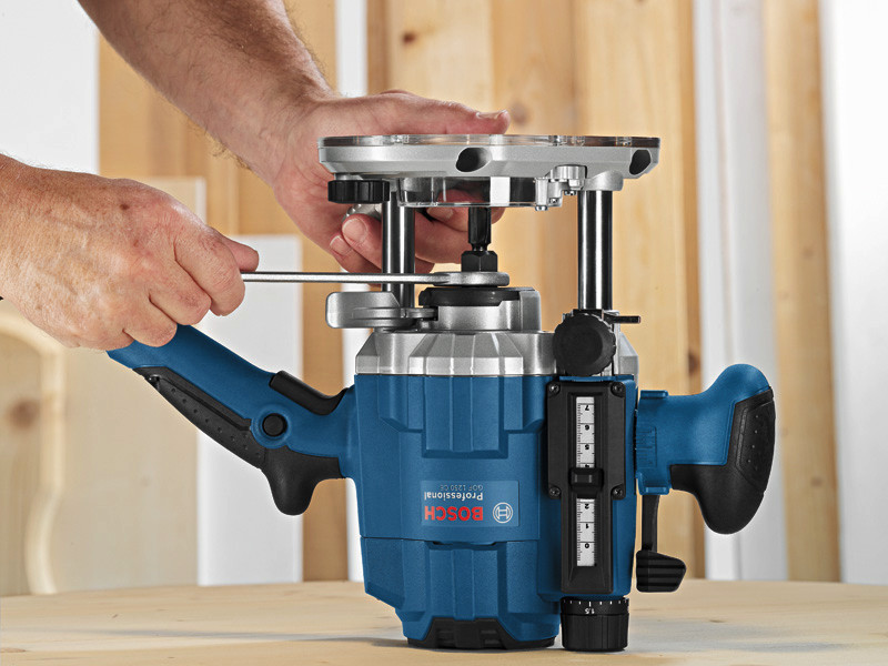 Oberfräse GOF 1250 CE, Die kabelgebundene Präzisionsoberfräse GOF 1250 CE Professional bietet komfortables Arbeiten bei guter Leistung. Das ergonomische Griffdesign ermöglicht eine bedienfreundliche Handhabung unabhängig von der Griffposition und damit eine hervorragende Werkzeugführung. Sie verfügt über eine patentierte Frästiefen-Feineinstellung in 1/10-mm-Schritten. Darüber hinaus sorgt die einzigartige Spindelarretierung für einen einfachen und schnellen Fräserwechsel. Dieses Elektrowerkzeug eignet sich für Fräsarbeiten in Holz und Plastik. Das Gerät ist kompatibel mit verschiedenen Bosch Führungsschienen und dem Bosch Click & Clean-Absaugsystem. Ferner verfügt die GOF 1250 CE Professional über Funktionen wie konstante Drehzahl und Drehzahlvorwahl. Maulschlüssel 19 mm (ET-Nr. 1 907 950 511). Parallelanschlag mit Feineinstellung (2 607 001 387). Kopierhülsenadapter (ET-Nr. 2 610 991 370). Spannzange mit Überwurfmutter 8 mm (2 608 570 102)