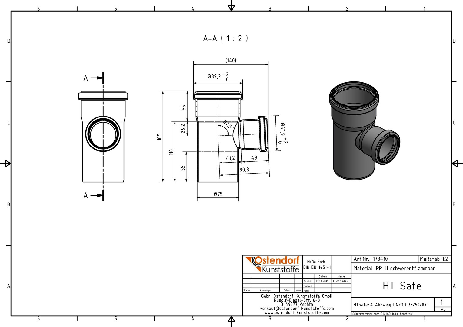 Ostendorf HTsafe Abzweig EA DN/OD 75/50 x 87,5°