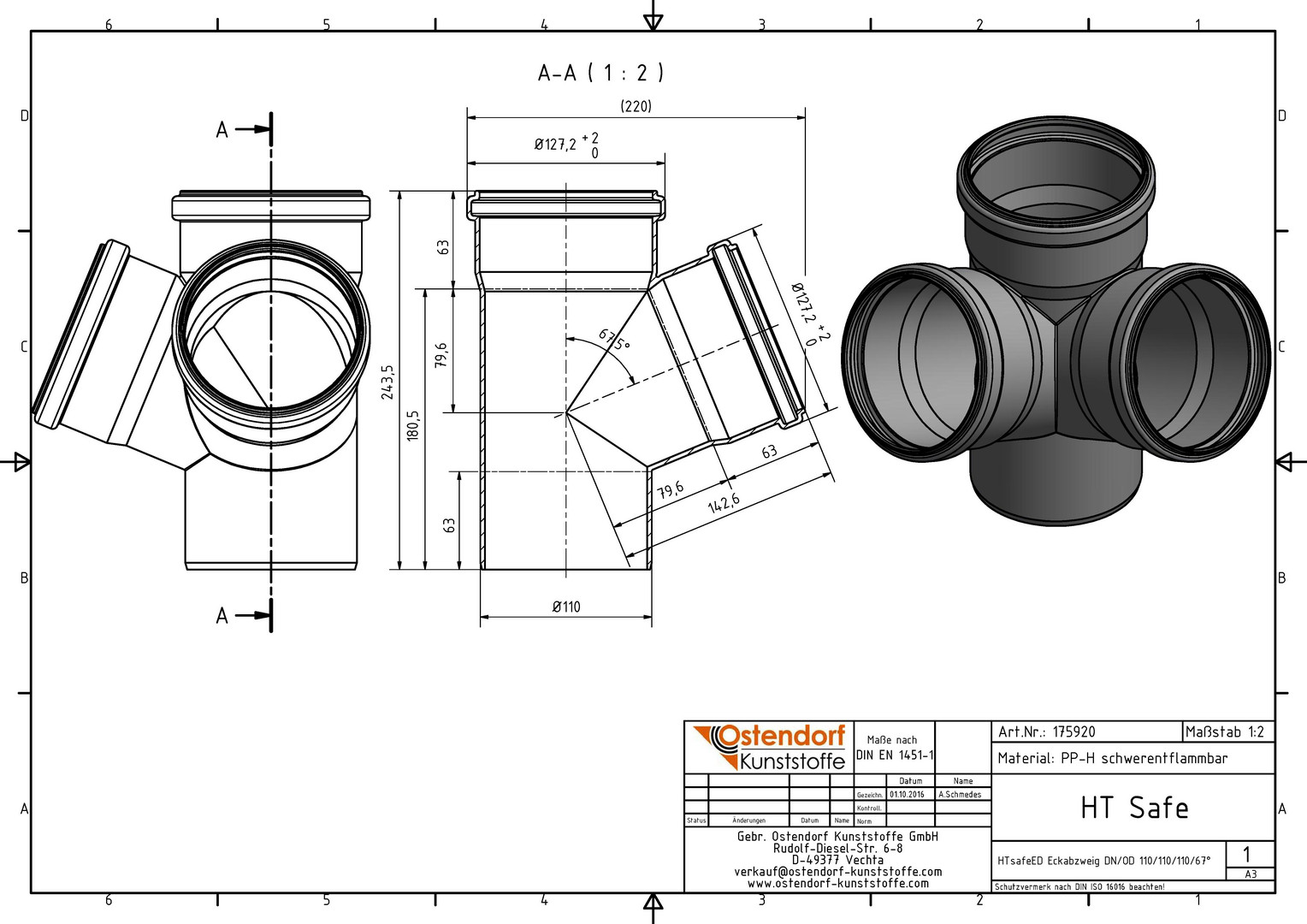 Ostendorf HTsafe Eckabzweig ED DN/OD 110 x 110 x 110, 67,5Grad, doppelt
