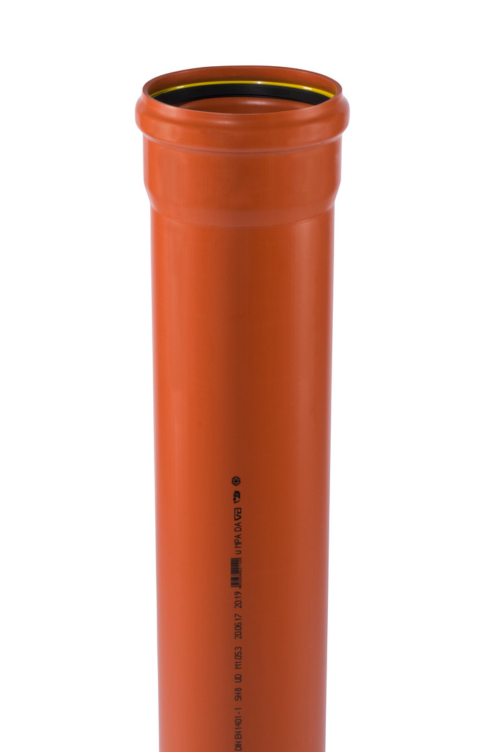 aus PVC-U (Polyvinylchlorid, weichmacherfrei), Vollwandrohre DIN EN 1401, Anwendung für erdverlegte Abwasserkanäle und -leitungen, Montage DIN EN 1610, DIN EN 476, DIN 1986-100, orangebraun RAL 8023, Dichtung das Vollwandrohr SN 10 wird mit einem deutlich verbesserten werkseitig eingelegten Dichtsystem angeboten, die neue Lippendichtung hat einen eingelegten Polypropylen-Stützring, die geforderte Dichtigkeit nach DIN EN ISO 13259 mit Druck und Vakuum wird weit übertroffen, der Dichtring wird nach DIN EN 681 gefertigt, für öl- und fetthaltige Abwässer sind NBR-Dichtringe zu verwenden, Chemische Beständigkeit Ableitung von aggressiven Medien im Bereich pH 1 bis pH 13, Vollwand-Rohre mit homogenem Wandaufbau