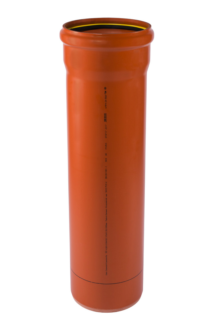 aus PVC-U (Polyvinylchlorid, weichmacherfrei), Vollwandrohre DIN EN 1401, Anwendung für erdverlegte Abwasserkanäle und -leitungen, Montage DIN EN 1610, DIN EN 476, DIN 1986-100, orangebraun RAL 8023, Dichtung das Vollwandrohr SN 10 wird mit einem deutlich verbesserten werkseitig eingelegten Dichtsystem angeboten, die neue Lippendichtung hat einen eingelegten Polypropylen-Stützring, die geforderte Dichtigkeit nach DIN EN ISO 13259 mit Druck und Vakuum wird weit übertroffen, der Dichtring wird nach DIN EN 681 gefertigt, für öl- und fetthaltige Abwässer sind NBR-Dichtringe zu verwenden, Chemische Beständigkeit Ableitung von aggressiven Medien im Bereich pH 1 bis pH 13, Vollwand-Rohre mit homogenem Wandaufbau