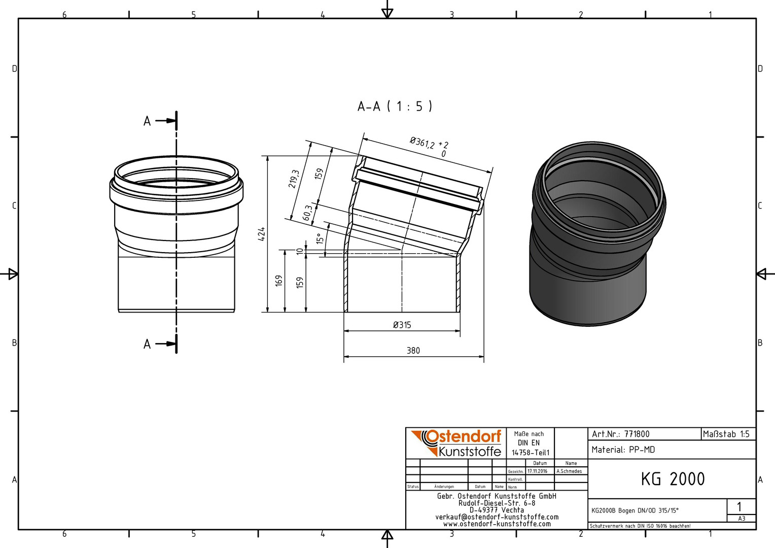 Ostendorf KG2000 Bogen B DN/OD 315, 15Grad