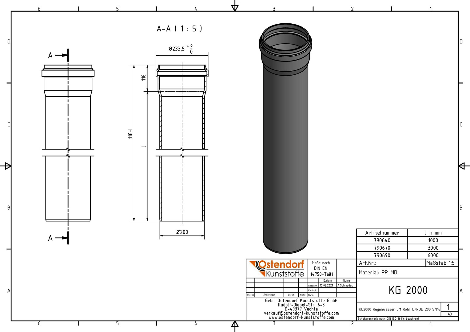 Ostendorf KG2000 Regenwasser-Rohr SN 16 EM DN/OD 200, 6000 mm, blau