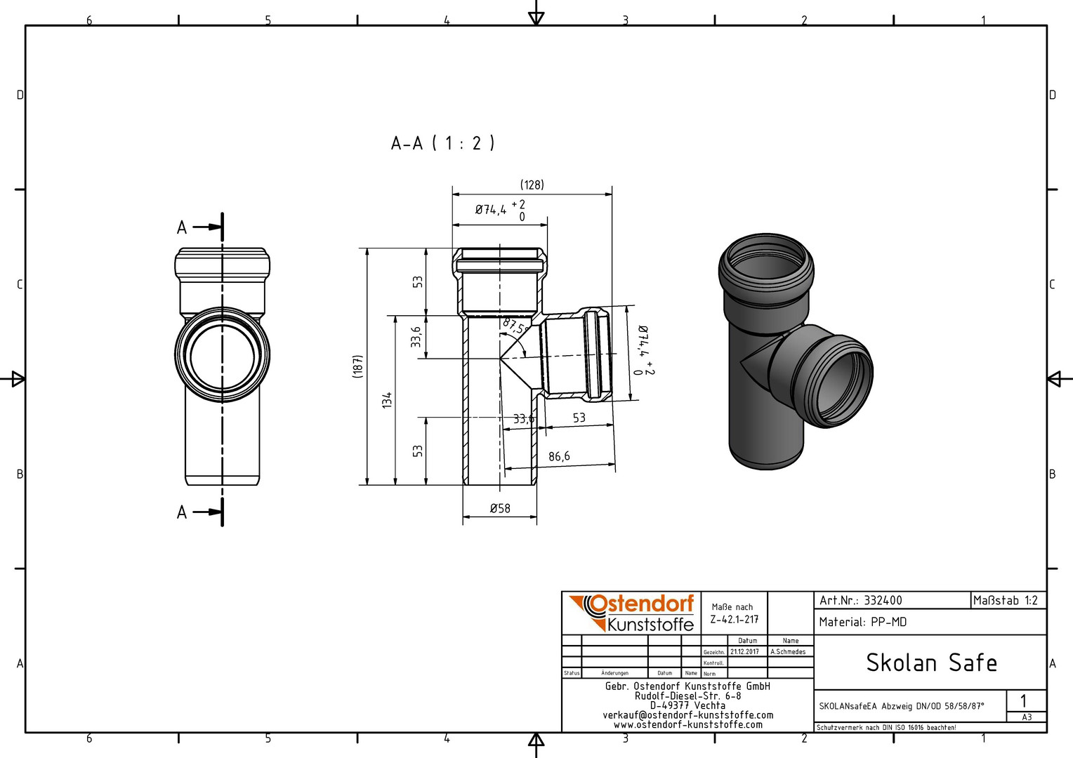Ostendorf SKOLANsafe Abzweig EA DN/OD 58/58, 87,5Grad
