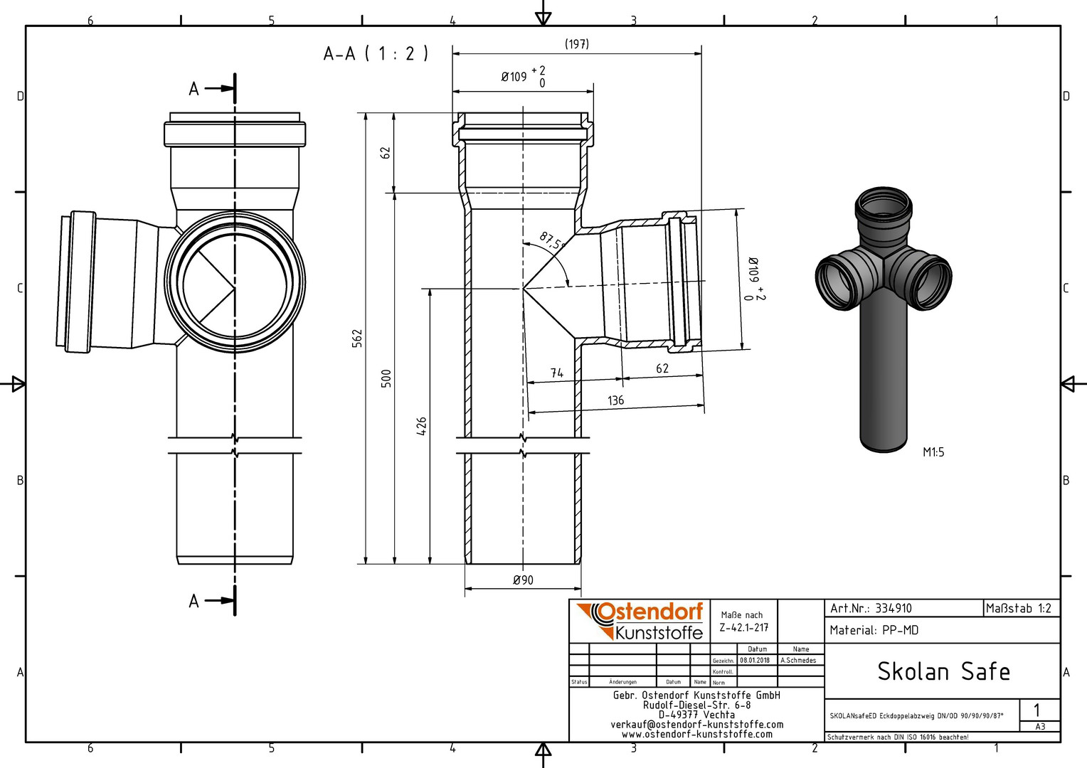 Ostendorf SKOLANsafe Eckdoppelabzweig ED DN 90/90/90 x 87,5°