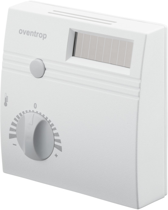 Sollwertversteller und Präsenztaster, solarbetrieben, mit Raumtemperaturfühler, Sollwertversteller für die Raumtemperatur und Präsenztaster für Absenk- und Komfortbetrieb, zur Aufputzmontage.