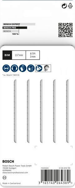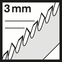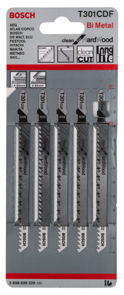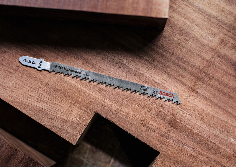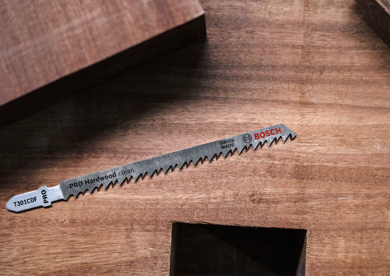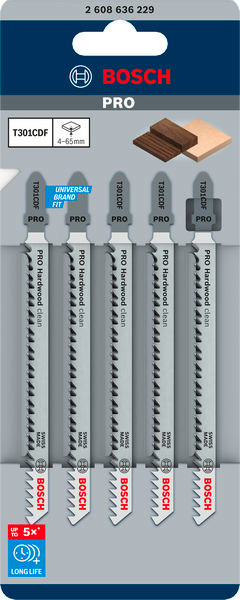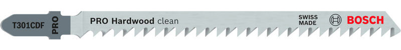Herausragende Lebensdauer in Hartholz! Bi-Metall Blatt: Kombiniert harte Zähne mit flexiblem Blattkörper Bist du Tischler und auf der Suche nach einem Stichsägeblatt zum Schneiden dickerer Werkstücke aus Hartholz? Ein Stichsägeblatt, das gerade, saubere Schnitte liefert? Mit dem PRO Hardwood clean T301CDF kannst du diese Arbeit erledigen. Das PRO Hardwood clean T301CDF Stichsägeblatt wurde aus BI-Metall hergestellt: Es verfügt über eine Zahnleiste aus Schnellarbeitsstahl (HSS), die mit einem Körper aus Kohlenstoffstahl (HCS) verbunden ist, um sicherzustellen, dass du Hartholz und abrasive Holzwerkstoffe problemlos bearbeiten kannst. Das Blatt hat eine konische Form und eine mittere Zahnteilung für saubere Schnitte, ohne hängen zu bleiben. Dank der erweiterten Länge kannst du massives Hartholz mit einer Dicke zwischen 4 und 65 mm schneiden.