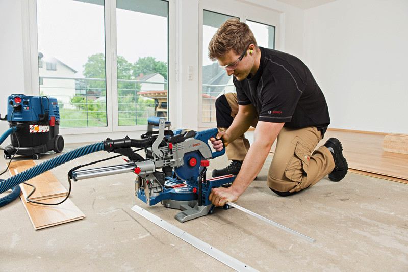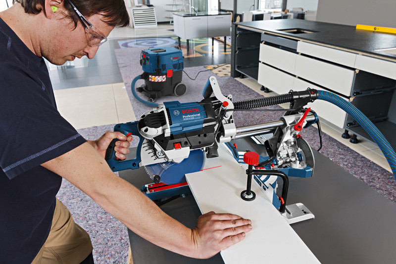 Paneelsäge GCM 8 SDE, Power und Flexibilität in einem Gerät: Die GCM 8 SDE Professional ermöglicht schnelles und präzises Arbeiten mit fast allen Materialarten. Durch ihren praktischen, einhändig verwendbaren Griff bietet sie ein leichtes und kompaktes Design für optimale Mobilität bei der Arbeit. Die variable Schnittgeschwindigkeit gewährleistet hohe Flexibilität beim Schneiden von Materialien wie Kunststoff und Aluminium. Für höchsten Komfort lässt sich das Sägeblatt schnell und werkzeuglos wechseln. Diese Kapp- und Gehrungssäge eignet sich für Quer-, Gehrungs-, Neigungs- und Nutenschnitte in Holz, Holzbalken und Holzverbundwerkstoffen sowie Plattenmaterialien, Fußbodenplatten, Aluminium und Kunststoff. Sie ist kompatibel mit dem Bosch Click & Clean-Staubabsaugsystem sowie verschiedenen Arbeitstischen. Die GCM 8 SDE Professional bietet außerdem Merkmale wie Zwei-Punkt-Staubabsaugung, Neigungsverriegelung, Präzisionslaser, Sanftanlauf, beidseitige Neigungseinstellung und Drehzahlvorwahl. Klemme (1 609 B04 224). 1 x Kreissägeblatt, Expert for Wood, 216 x 30 x 2,4 mm, 48 (2 608 642 497). SDS-Sägeblattarretierung (ET-Nr. 1 609 B05 323)