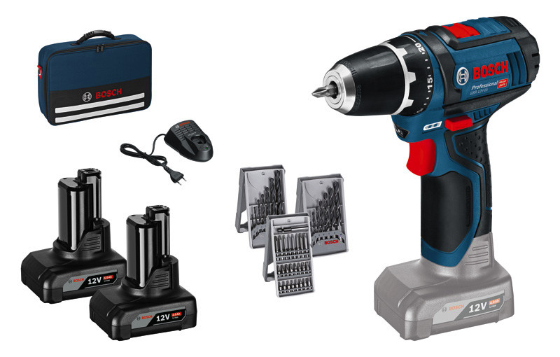 Professional-Set: Akku-Bohrschrauber GSR 12V-15 in Tasche + 39-teiliges Zubehör in Handwerkertasche. Mehr Schraubpower – mehr Zubehör!. Schnellladegerät GAL 1215 CV (2 607 226 104). 2 x Akku GBA 12V 4.0Ah (1 600 Z00 02Y). 25tlg. Schrauberbit-Set (2 607 017 037). 7tlg. Metallbohrer-Set, HSS-R (2/3/4/5/6/7/8 mm) (2 607 017 036). 7tlg. Holzbohrer-Set (3/4/5/6/7/8/10 mm) (2 607 017 034). Handwerkertasche
