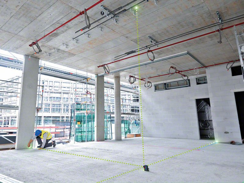Punktlaser GPL 5 G. Der 5-Punkt-Laser GPL 5 G Professional überzeugt mit seinem strapazierfähigen und kompakten Design und ist die ideale Wahl für Übertragungen bei Wänden mit 90-Grad-Winkel. Seine grünen Laserpunkte bieten eine bis zu viermal bessere Sichtbarkeit als rote Punkte. Mit seinem gummiummantelten Gehäuse und dem eingelassenen Glas sowie Staub- und Strahlwasserschutz nach IP 65 eignet sich der GPL 5 G Professional auch für raue Baustellenbedingungen. Dieser 5-Punkt-Laser ist in kürzester Zeit transportbereit dank der eingebauten Drehhalterung mit starken Magneten für eine schnelle und sichere Werkzeugbefestigung. Der GPL 5 G Professional ist ideal für die Raumaufteilung mit 90-Grad-Winkeln und die Übertragung von Referenzpunkten vom Boden zur Decke. Er eignet sich sehr gut für Klempnerarbeiten und die Errichtung von Trockenbauwandrahmen. Dieser 5-Punkt-Laser verfügt auch über ein benutzerfreundliches Interface mit einem Zweipositionsschalter: Beim Einschalten nivelliert der Laser sich automatisch selbst, beim Ausschalten wird die Pendelarretierung aktiviert. Im Lieferumfang enthalten: Tasche, 2x 1,5 V LR6-Batterie (AA)