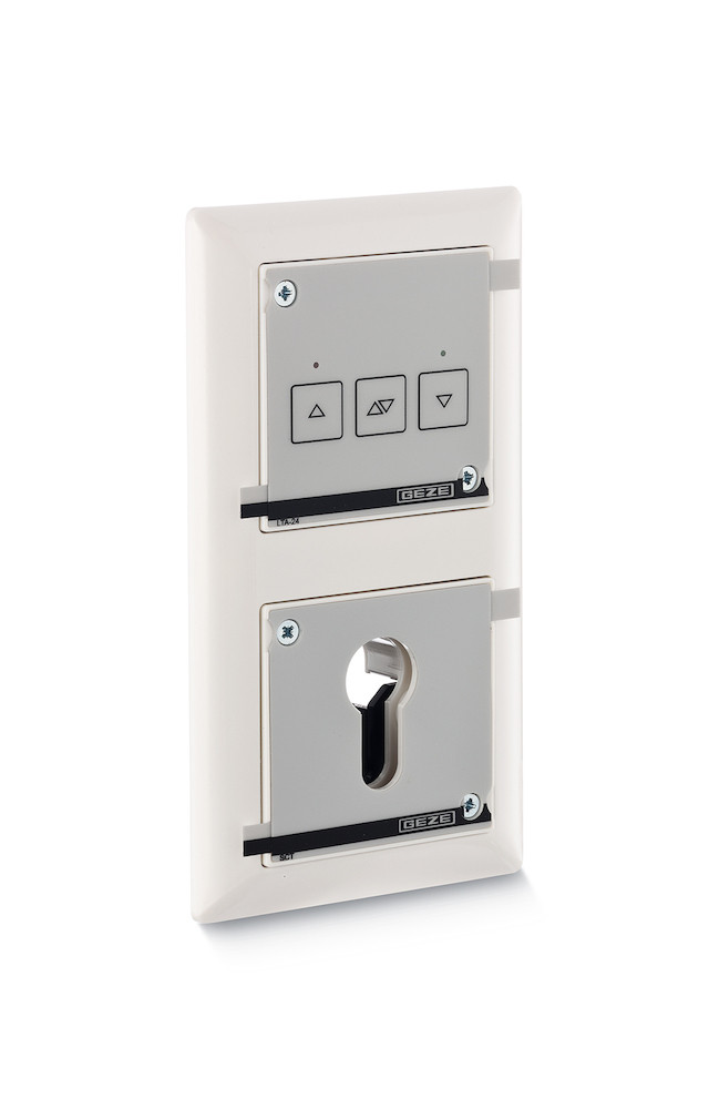 GEZE Lüfter/-Schlüsseltaster AS 500 LTA-24-SCT; Gehäusematerial: Kunststoff; Montageart: Unterputz; Einsatzbereich: Rauchwärmeabzug; Basis: Lüfter/-Schlüsseltaster; Ausführung: Dreifach-Taster,mit Zweifach-Rahmen; Breite: 80mm; Gehäusefarbe: weiß; Höhe: 150mm; Tiefe: 15mm; Eingangsspannung: 24V; LED Anzeige: Auf-Zu; Tastenfunktion: Auf-Stopp-Zu