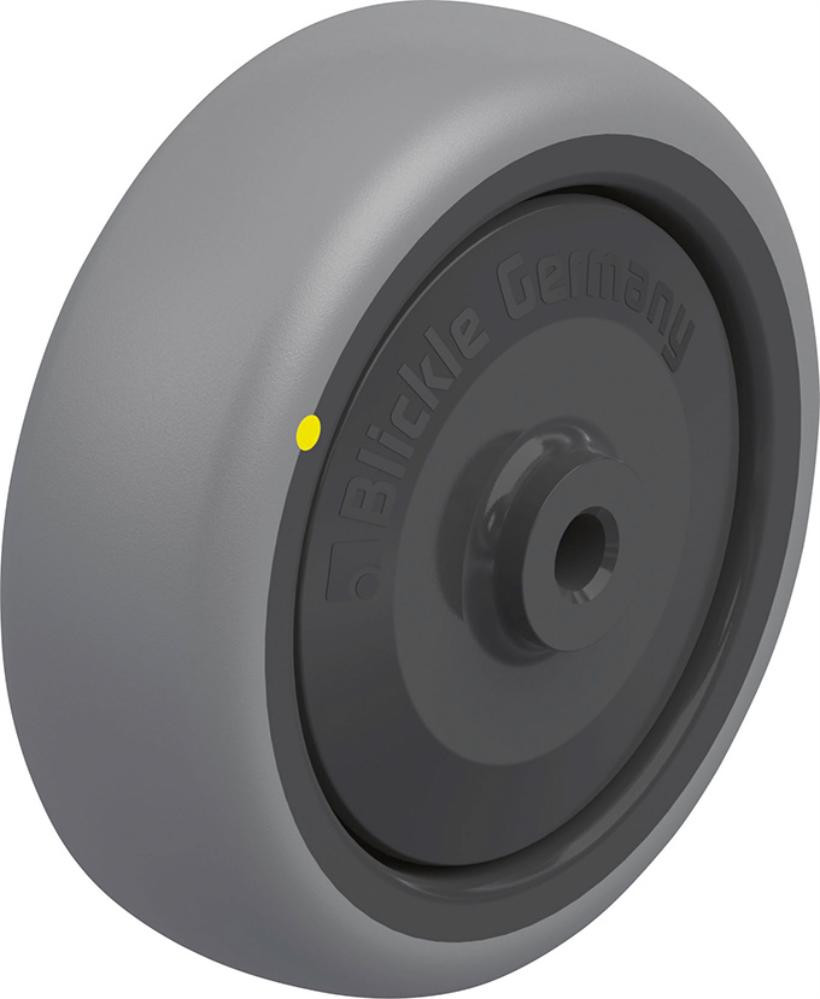 • Rad: thermoplastisches Gummi-Elastomer (TPE), 85 Shore A, Farbe grau, spurlos, geringer Roll-Schwenkwiderstand, elektrisch leitfähig