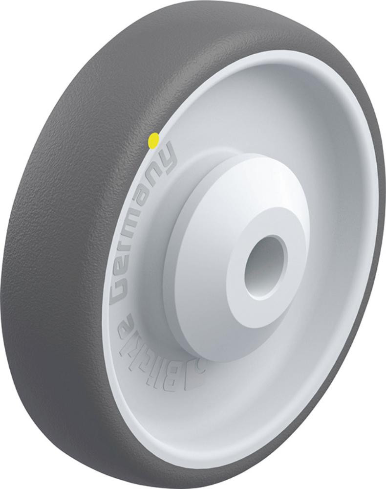 Rad: hochwertiges thermoplastisches Polyurethan (TPU), 94 Shore A, Farbe dunkelgrau, spurlos, geringer Roll- und Schwenkwiderstand, antistatisch, elektrisch leitfähig
