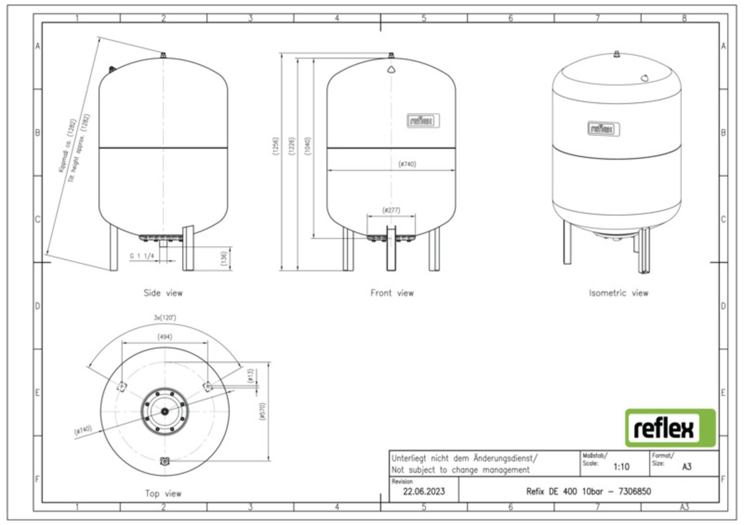 für Anlagen die nicht den Anforderungen der DIN 1988 unterliegen (z. B. Feuerlösch-, Betriebswassersysteme, Fußbodenheizungen, Geothermie), bis 33 l mit Befestigungslaschen, wasserberührende Teile korrosionsgeschützt, Vollmembran nach DIN EN 13831/ab 50 l tauschbar, für Frostschutzmittelzusatz mindestens 25-50 %, nicht durchströmt, ohne Absperrung und ohne Entleerung, ab Ø 1000 mm mit Manometer, Manometer und Vordruckventil durch Metallbügel geschützt, Zulassung gemäß Richtlinie über Druckgeräte 2014/68/EU, Epoxidharzbeschichtung, mit werkseitig druckbeaufschlagtem Gasraum, WRAS und ACS zertifizierte Gefäße auf Anfrage, 10/16 bar >= 1000 l/Ø 1000 mm sind mit einer Membranbruchmelder-Muffe ausgestattet