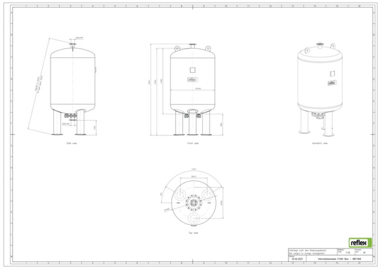 bis 20 l mit Befestigungslaschen, ab 40 l mit Füßen, ohne Membran, erforderlich bei Anlagen mit Rücklauftemperaturen größer der maximal erlaubten Betriebstemperatur des MAG oder in Kälteanlagen mit Temperaturen kleiner der maximal erlaubten Betriebstemperatur des MAG, Zulassung gemäß Richtlinie über Druckgeräte 2014/68/EU, Einsatz auch als Pufferspeicher möglich, Sonderbehälter > 10 bar/> 120 °C auf Anfrage, Epoxidharzbeschichtung