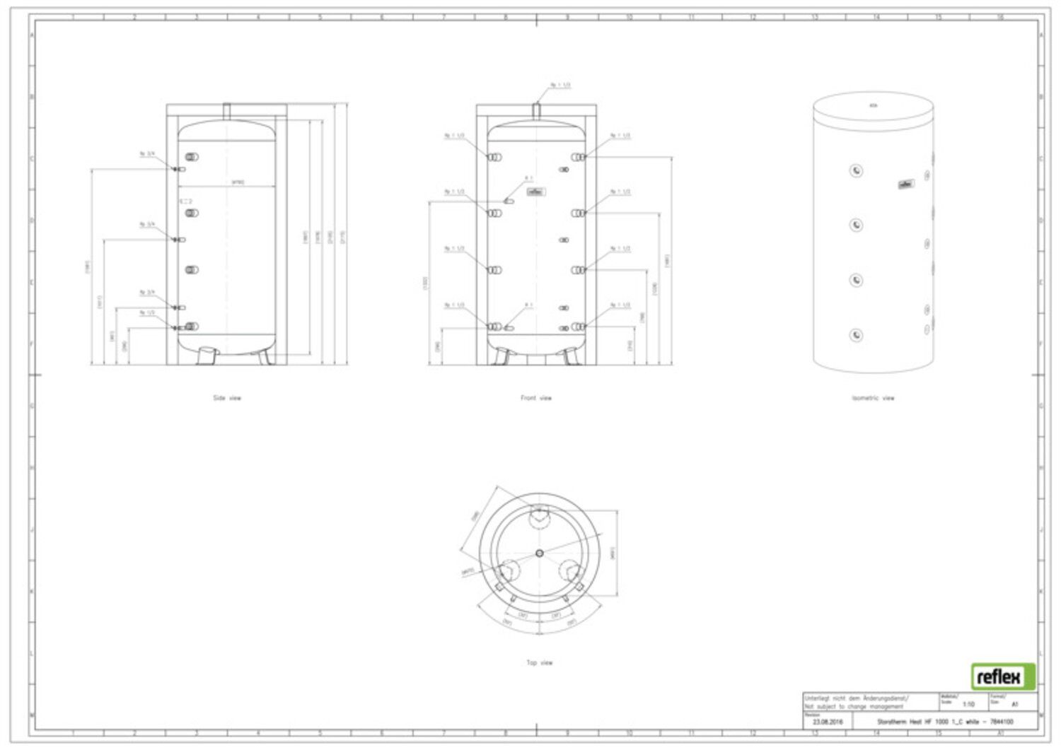 Reflex Pufferspeicher Storatherm Heat HF 1000/1_C, Ø 990 mm, 3 bar, mit Isolierung und Glattrohrwärmeübertrager, weiß