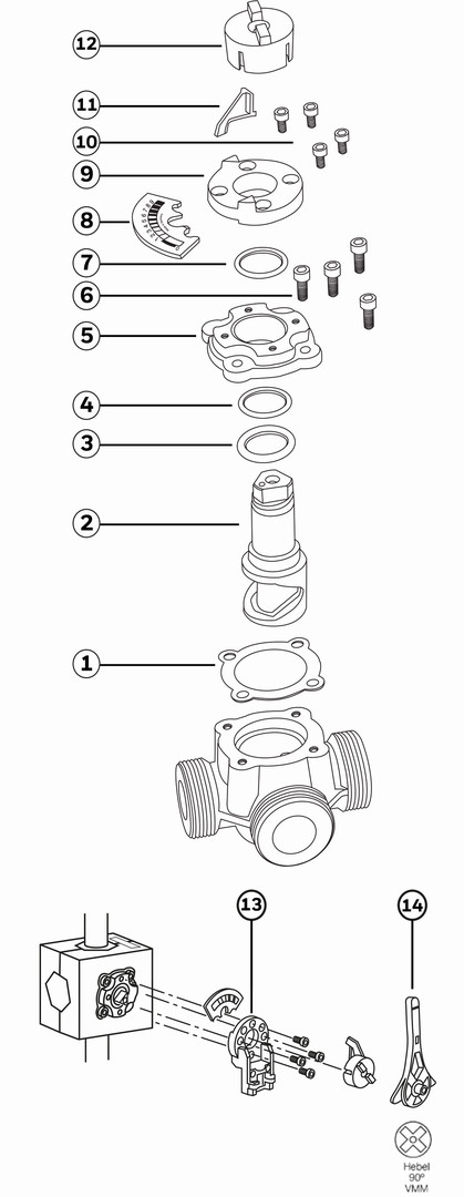 rundum vertauschbare Anschlüsse, flexibler Einbau, mit Wärmedämmschalen, Medium ist Wasser, Gehäuse aus Grauguss GG 20 (Drehschieber aus Grauguss GG 20/verchromt), Drehwinkel 90°, Mediumstemperatur 2-130 °C, Rohranschluss Außengewinde, max. Differenzdruck 100 kPa, Drehmoment für max. dP 20 Nm