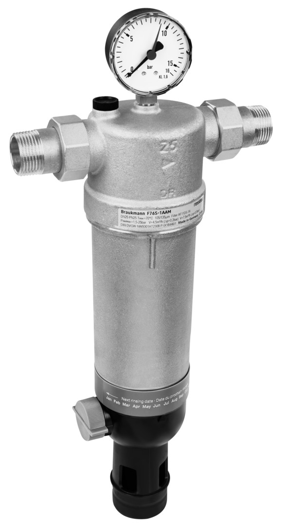 max. Vordruck 25 bar, Rotguss-Filtertasse, Gewindetülle, Filterfeinheit 100 µm, DIN/DVGW/SVGW-geprüft, ununterbrochene Sicherung der Wasserversorgung mit gefiltertem Wasser, der Feinfilter verhindert das Einspülen von Fremdpartikeln und reduziert die Korrosionswahrscheinlichkeit, das Gerät entspricht den Anforderungen der jeweils gültigen DIN/DVGW Vorgabe, Double Spin Technologie für die Nennweiten 1/2" bis 1 1/4", Kartusche mit außenliegendem Rohr (dadurch gleichzeitige Reinigung von unterem und oberen Filterbereich), visuelle Funktionskontrolle möglich, auch während der Rückspülung Versorgung mit gefiltertem Wasser, Memory-Ring als Hinweis auf die nächstfällige manuelle Rückspülung, Rückspülautomatik mit Bajonett-Anschluss nachrüstbar, große Filterfläche, Filtertasse aus stoßfestem Kunststoff ermöglicht Kontrolle der Filterverschmutzung, Filtereinsatz und komplette Filtertasse austauschbar, normierter Ablaufanschluss, ACS-zertifiziert, alle Materialien gemäß KTW, von TÜV LGA als geräuscharm zugelassen - Gruppe 1 ohne Einschränkungen, Medium Trinkwasser, min. Eingangsdruck 1,5 bar, rückspülbar, Betriebstemperaturbereich 5-30 °C gemäß DIN EN 1567, Ventilkörper aus entzinkungsbeständigem Messing, Rückspülung mit gefiltertem Wasser, Einbaulage horizontal
