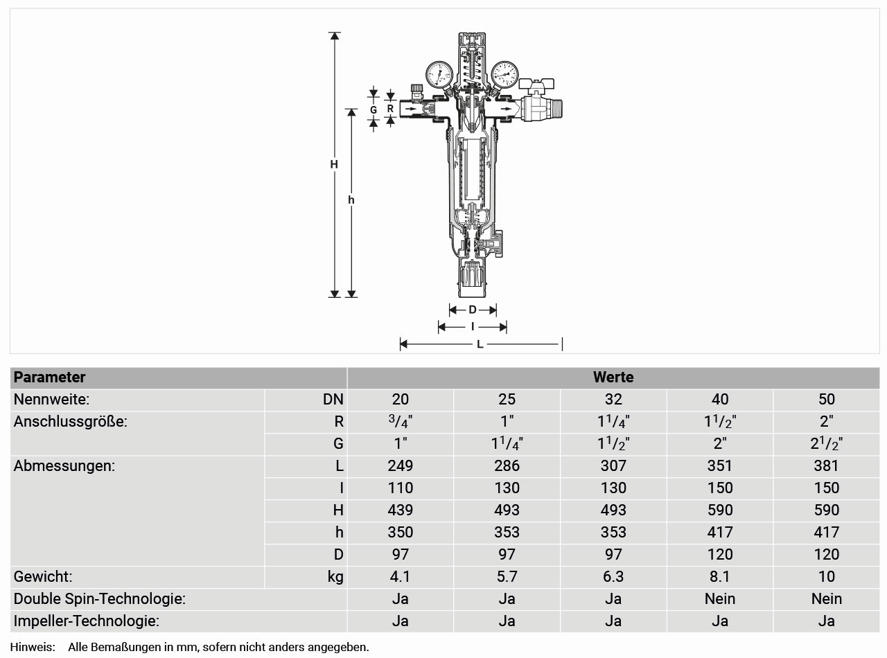 integriert Rückflussverhinderer mit Prüfventil, rückspülbaren Feinfilter, Druckminderer und Absperrventil in einem Gerät, sichert ununterbrochen die Wasserversorgung mit dem auf die jeweilige Trinkwasser-Installation eingestellten Druck und mit gefiltertem Trinkwasser, der Feinfilter verhindert das Einspülen von Frempartikel und reduziert so die Korrosionswahrscheinlichkeit und sorgt für hygienisch reines Trinkwasser, der Rückflussverhinderer schützt das Trinkwassernetz vor Rückdrücken / Rückfließen und Rücksaugen von Flüssigkeiten der Flüssigkeitskategorie 2, der Druckminderer vermeidet Druckschäden und senkt den Energie- und Trinkwasserverbrauch, mit Eingangs- und Ausgangsmanometer, Material bleifrei (Bleigehalt aller Materialien weniger als 0,1 %), DoubleSpin Technologie für die Nennweiten 1/2" bis1 1/4", Kartusche mit außenliegendem Rotor, dadurch gleichzeitige Reinigung von unterem und oberem Filterbereich, bei gleichzeitiger visueller Funktionskontrolle, auch während der Rückspülung Versorgung mit gefiltertem Wasser, Rückspülsystem für Reinigen des Filters bei gleichzeitig geringem Wasserverbrauch, Rückspülautomatik mit ISO-Flansch-Anschluss nachrüstbar, Ventileinsatz aus hochwertigem Kunststoff (komplett austauschbar), Vordruckkompensation - schwankender Vordruck hat keinen Einfluss auf den Hinterdruck und damit auf die Nutzung der Trinkwasser-Installation, Filtertasse aus stoßfestem Kunststoff ermöglicht eine visuelle Kontrolle der Filterverschmutzung, Filtereinsatz und komplette Filtertasse austauschbar, alle Materialien gemäß UBA KTW, vom TÜV LGA als geräuscharm zugelassen - Gruppe 1 ohne Einschränkungen, DVGW und SVGW Zertifizierung für alle Filter mit 100 µm Filterfeinheit, Medium Trinkwasser, Filtereinheit 100 µm, max. min. Eingangsdruck 1,5 bar, max. Vordruck 16 bar, Mediumstemperatur 30 °C, Rohranschluss AG, Druckbereich 1,5-6 bar, mit Einstellskala, Einbaulage horizontal