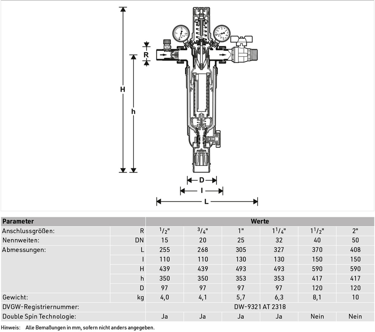 integriert Rückflussverhinderer mit Prüfventil, rückspülbarer Feinfilter, Druckminderer und Absperrventil in einem Gerät, ununterbrochene Sicherung der Wasserversorgung mit gefiltertem Wasser, der Feinfilter verhindert das Einspülen von Fremdpartikeln und reduziert so die Korrosionswahrscheinlichkeit, der Rückflussverhinderer schützt das Trinkwassernetz vor Rückdrücken/Rückfließen und Rücksaugen gesundheitsschädlicher Flüssigkeiten, der Druckminderer vermeidet Druckschäden und senkt den Wasserverbrauch, Double Spin Technologie für die Nennweiten 1/2" bis 1 1/4", Kartusche mit außenliegendem Rotor (dadurch gleichzeitige Reinigung von unterem und oberem Filterbereich), visuelle Funktionskontrolle möglich, auch während der Rückspülung Versorgung it gefiltertem Wasser, Rückspülsystem für schnellen und gründliches Reinigen des Filters bei gleichzeitig geringem Wasserverbrauch, Rückspülautomatik mit Bajonett-Anschluss nachrüstbar, Filtertasse aus stoßfestem Kunststoff ermöglicht eine Kontrolle der Filterverschmutzung, Vordruckkompensation, Filtereinsatz und komplette Filtertasse austauschbar, Ventileinsatz aus Kunststoff (komplett austauschbar), ACS-zertifiziert, alle Materialien gemäß KTW, von TÜV LGA als geräuscharm zugelassen - Gruppe 1 ohne Einschränkungen, Zertifizierungen DVGW (Zertifizierung für alle Filter mit 100 µ Filtereinheit), SVGW (Zertifizierung für alle Filter mit 100 µ Filtereinheit), Medium Trinkwasser, min. Eingangsdruck 1,5 bar, Ventilkörper aus entzinkungsbeständigem Messing, Federhaube aus Kunststoff, Rohranschluss Außengewinde, Druckbereich 1,5-6 bar, Einstellskala ja, entlastetes Einsitzventil ja, Einbaulage horizontal