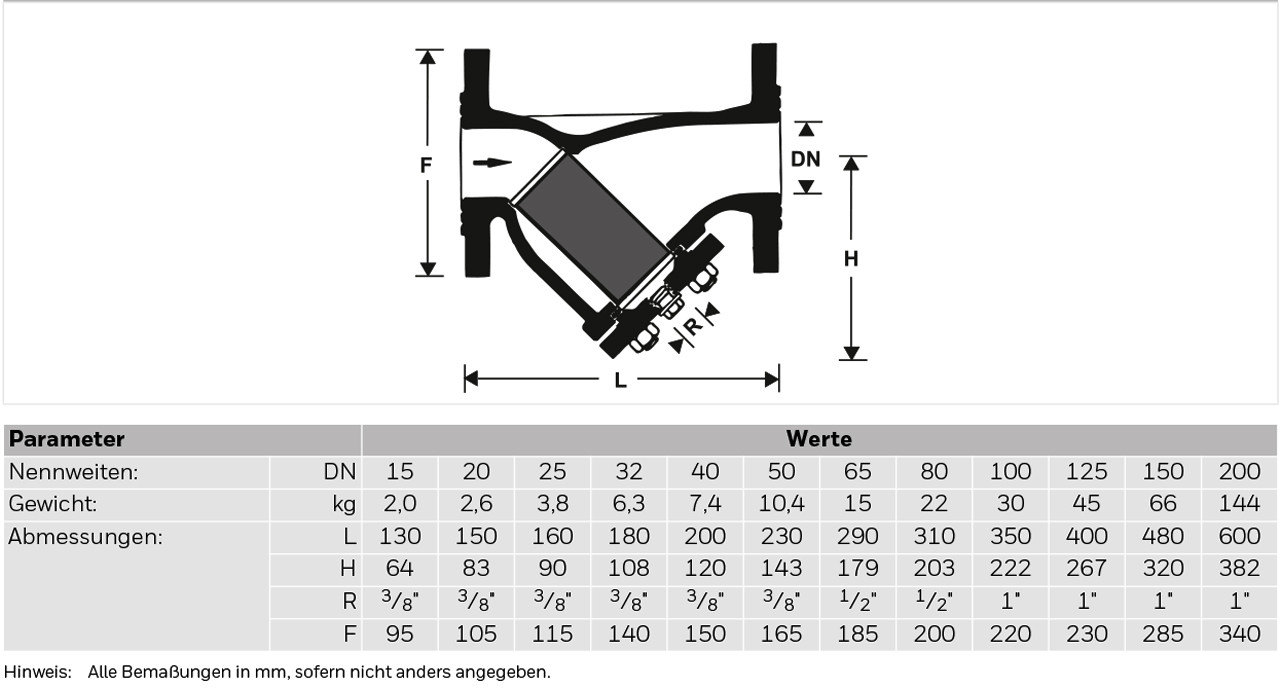 werden in industriellen und gewerblichen Anlagen, aber auch in der zentralen Wasserversorgung unter Berücksichtigung ihrer Spezifikationen verwendet, schützen Anlagen vor Funktionsstörungen und Korrosionsschäden, Material bleifrei mit einem Bleianteil kleiner 0,1 %, geringer Durchflusswiderstand durch strömungstechnisch günstige Form, innen und außen pulverbeschichtet (Pulver ist physiologisch und toxikologisch unbedenklich), korrosionsbeständiges Doppelsieb durch Verwendung von nichtrostendem Stahl, durch Siebträger dichter Siebabschluss im Gehäuse, durch Öffnen des Stopfenverschlusses können Schmutzpartikel oder Kondensat bei Druckluftanlagen ausgespült werden, Medium Wasser /Öl/Druckluft und andere nicht aggressive Medien, Ventilkörper aus Grauguss GG 25, Rohranschluss Flansche, max. Mediumstemperatur 85 °C, stat. Druck PN 16, Einbaulage horizontal oder vertikal, max. Betriebsdruck 16 bar