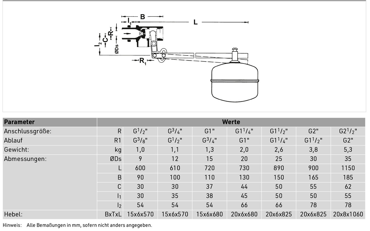 steuert einen Flüssigkeitsstand in offenen oder geschlossenen (drucklosen) Behältern oder dienen zur Befüllung von Wasservorratsbehältern, für industrielle und gewerbliche Zwecke, insbesondere für die öffentliche Wasserversorgung unter Berücksichtigung ihrer Spezifikation, eine Weichdichtung sorgt für dichten Ventilabschluss auch bei schwankenden Vordrücken, Schwimmer waagerecht und senkrecht verstellbar, offene Bauart, Anschluss AG nach DIN 228, Sitzdichtung und Kolben austauschbar