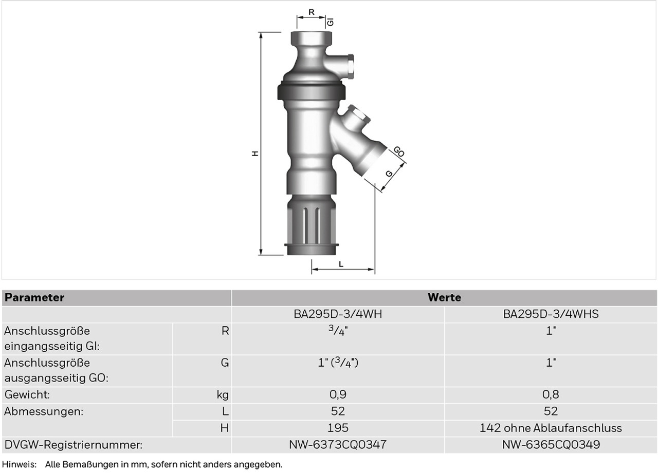 geeignet zum Schutz von Trinkwassersystemen vor Rückdrücken, Rückfließen und Rücksaugen, Verwendung zum Schutz der Trinkwassers bei Wasserentnahme an Auslaufventilen im Haushalt/im Garten oder an Entnahmestellen, weitere Einsatzmöglichkeiten sind Volksfeste (z.B. Bierwagen, Toilettenwagen) und in der Landwirtschaft sowie in Gartenbaubetrieben, Instandhaltung durch Austauscheinheit - alle BA-Funktionsteile in einem Gehäuse, Austausch/Wartung ohne zeitaufwändige Funktionskontrolle, High-Speed-Konzept, durch optimierte Position des Ausgangs wird Biegung des angeschlossenen Schlauch vermieden, integrierter Schmutzfänger eingangsseitig, eingangsseitiger Rückflussverhinderer und Ablassventil in einem Kartuscheneinsatz kombiniert, drehbares Gehäuse, Schmutzsieb und Ventileinsatz ohne Entleerung des Systems komplett austauschbar, totraumfrei (im bestimmungsgemäßen Betrieb keine Stagnation), kompakter Aufbau, geringer Druckabfall und hohe Durchflussleistung, alle Materialien gemäß KTW, von TÜV LGA als geräuscharm zugelassen - Gruppe 2, jede Entnahmestelle kann einzeln abgesichert werden, schwenkbarer Kopfanschluss, mit eingangsseitig G 3/4 (ISO 228-1) Anschlussgewinde und ausgangsseitig G 1 (ISO 228-1) Anschlussgewinde, 1" IG auf 3/4" AG Gewindeadapter beiliegend, mit Ablaufanschluss, Zertifizierungen DVGW, Medium Trinkwasser, Flüssigkeitskategorie (EN1717) Kategorie 4, Gehäusematerial aus entzinkungsbeständigem Messing, Anschlussdurchmesser 3/4", Nennweite DN 15 mm, max. Mediumstemperatur 65 °C, min. Eingangsdruck 1,5 bar, max. Vordruck 10 bar, Einbaulage vertikal