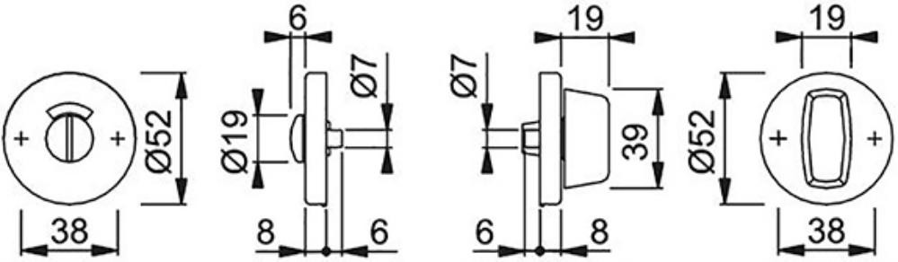 • Mit Schlitzkopf/Olive und Rot/Weiß-Scheibe für Bad-/WC-Türen