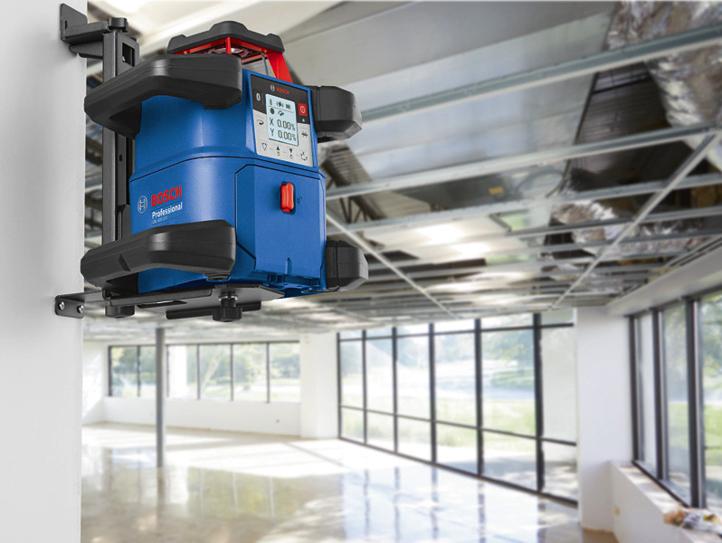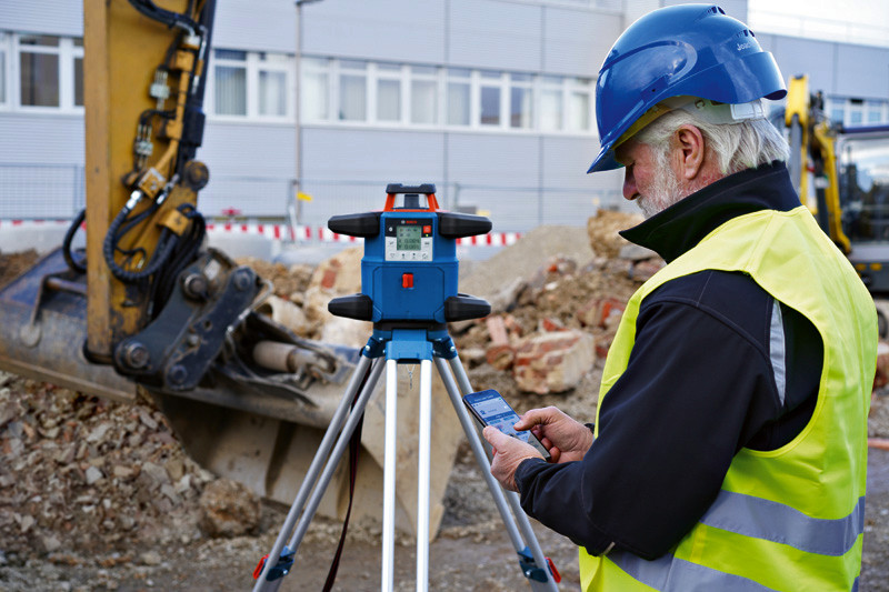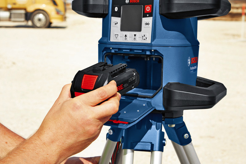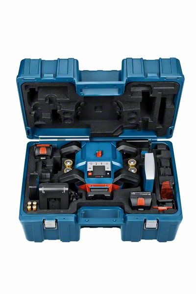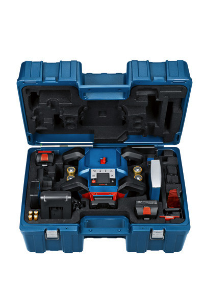 Rotationslaser GRL 600 CHV, Stabil, baustellensicher – der robuste GRL 600 CHV Professional bewährt sich auch unter härtesten Bedingungen. Seine stabile Bauweise macht ihn stoßfest und bietet gemäß IP68 Schutz gegen Staub und Wasser (einschließlich Batteriefach) für äußerst flexibles Arbeiten trotz schlechten Wetters. Er bietet praktische Konnektivität und gewährleistet so fokussierteres Arbeiten mit weniger Zeitverschwendung. Dank seines Bildschirms und des Zugangs zur Levelling Remote App, die alle Funktionen, einschließlich der Zweifach-Neigungseinstellung, visualisiert und damit wertvolle Zeit spart, ist die Bedienung des Geräts intuitiv. Dieser hochpräzise Laser bietet sowohl mit dem 18V-Akkusystem als auch mit den beigelegten Alkali-Batterien lange Betriebszeit für unterbrechungsfreies Arbeiten. Dieses Werkzeug ist konzipiert für Außenanwendungen, bei denen es um Aushub-, Betonier-, Gartenbau- und Fassadenarbeiten geht. Der GRL 600 CHV bietet außerdem einen hochwertigen Empfänger mit 125 mm Empfangsfläche, zweiseitigem Display und einer Versatzfunktion in Millimeter. Das Kalibrieren des Werkzeugs erfolgt schnell und einfach entsprechend den schrittweisen Anweisungen in der intuitiven App - das spart Zeit und Ressourcen und garantiert bei jeder Arbeit exakte Resultate. Mit dem in der App verfügbaren praktischen „Maskenmodus“ können Reflexionen und Interferenzen mit anderen Geräten auf der Baustelle vermieden werden. Laser-Empfänger LR 60 Professional (0 601 069 P00). Empfängerhalterung RB 60 Professional. Akku-Adapter BA 1 Professional. 4 x Batterie LR20 1,5V (D). 2 x 1,5 V LR6-Batterie (AA). L-BOXX 374 (1 600 A01 2G3)