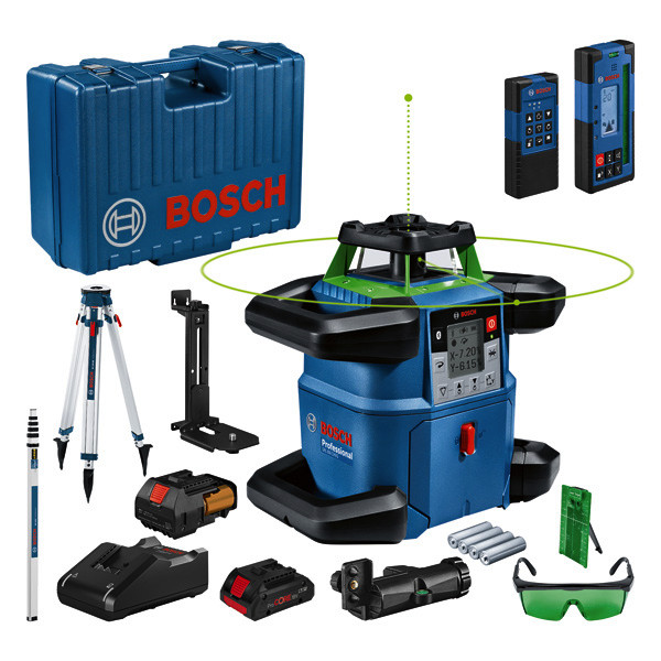 Rotationslaser GRL 650 CHVG, Der robuste Rotationslaser GRL 650 CHVG Professional mit Bluetooth®-Konnektivität setzt neue Maßstäbe für Präzision und Effizienz beim Nivellieren auf der Baustelle. Grüne Lasertechnologie sorgt für eine bessere Sichtbarkeit bei unterschiedlichen Lichtverhältnissen. Der strapazierfähige Rotationslaser eignet sich für die Verwendung bei rauen Baustellenbedingungen und schlechtem Wetter, übersteht Stürze bis zu 2 m bei umkippendem Stativ und erfüllt die IP68-Anforderungen zum Schutz gegen Staub und Wasser. Die Verwendung der Levelling Remote App für die Einstellungsübersicht und Fernbedienung spart Zeit und erlaubt volle Konzentration auf die Arbeit. Der vielseitige GRL 650 CHVG Professional eignet sich besonders für Nivellier- und Planierarbeiten im Außenbereich sowie für die Installation von Wänden, Decken und Klimaanlagen im Innenbereich. Eine lange Laufzeit für mehr Komfort durch die Wahl zwischen zwei Optionen: 18-V-Li-Ion-Akku von Bosch oder Alkali-Batterien (Monozellen). Optimaler Komfort dank High-Tech-Ausstattung wie Display, Doppelneigungsfunktion, Neigungsspeicherung und hochwertiger Empfänger (LR 65 G Professional). Laser-Empfänger LR 65 G Professional (0 601 069 T00). Empfängerhalterung RB 60 Professional. Fernbedienung RC 6 Professional. 1 x Akku ProCORE18V 4.0Ah (1 600 A01 6GB). Schnellladegerät GAL 18V-40 Professional (1 600 A01 9RJ). Akku-Adapter BA 1 Professional. Wandhalter WM 6 Professional. 4 x Batterie LR20 1,5V (D). 4 x 1,5 V-LR6-Batterie (AA). Laserzieltafel. Lasersichtbrille (grün) (ET-Nr. 1 608 M00 05J). Handwerkerkoffer. Baustativ BT 170 HD Professional (0 601 091 300).