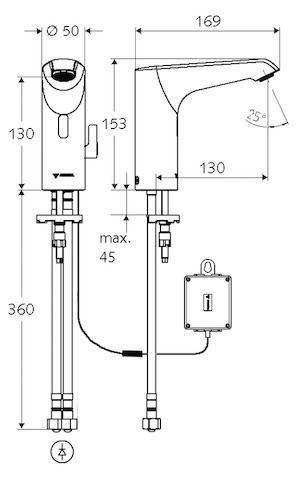 Hochdruck Mischwasser, Infrarot-Sensor gesteuert, Batteriebetrieb, geeignet zur Vernetzung mit Wassermanagement-System SWS, parametrierbar über Single Control SSC, mit Infrarot-Sensor-Einlocharmatur, Temperaturregler, Infrarot-Sensor-Elektronik, programmierbar, Axialmagnetventil 6 V mit Vorfilter, Strahlregler, Anschlusskabel 220 mm, mit Steckverbinder 3-polig, Schutzklasse IP 65, Batteriefach 6 V, Schutzklasse IP 65, 4x AA Alkalibatterien 1,5 V, 2 flexible Anschlussschläuche Clean-Fix S G 3/8 IG x 400 mm, mit integriertem Rückflussverhinderer (RV, EN 1717: EB) und Vorfilter, Befestigungsmaterial für Waschtischmontage, Einstellmöglichkeiten über SWS/SSC: Sensor-Reichweite (kurz/mittel/lang), Programmierung über Nahreflex (Aus/Ein), max. Laufzeit (1-360 s), Nachlaufzeit (0,6-60 s), Stagnationsspülung (Aus/5-600 s, alle 1-240 h nach letzter Spülung/alle 1-240 h), Dauerspülung für thermische Desinfektion, mit Verbrühungsschutz (Aus/15-600 s), Dauerfluss (Aus/15-600 s), Energiesparmodus (Aus/1-254 h nach letzter Nutzung), Reinigungsstopp (Aus/60-360 s), Einstellmöglichkeiten über Nahreflex: Sensor-Reichweite (kurz/mittel/lang), Stagnationsspülung (Aus/30 s, alle 24 h nach letzter Spülung/alle 24 h), Dauerspülung für thermische Desinfektion, mit Verbrühungsschutz (Aus/300 s/120 s), Reinigungsstopp (Aus/60 s), Durchfluss max. 5 l/min druckunabhängig, Fließdruck 1,0-5,0 bar, max. Ruhedruck 8 bar, max. Betriebstemperatur 70 °C (80 °C für thermische Desinfektion), Gehäuse aus Messing, wasserführende Teile aus Kunststoff, Oberfläche chrom, Zertifikate: P-IX 29072/IO, ACS, Belgaqua, WELL public, Geräuschklasse I, Durchflussklasse O