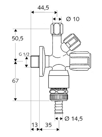 Werkstoff Messing konform TrinkwV, Abgang Ø 10 mm (DN 10 G 3/8 AG), Schlauchverschraubung Ø 14,5 mm (DN 20 G 3/4 AG), Sicherungseinrichtung gemäß EN 1717: HD, Geräuschklasse II, bei 100% Durchfluss, Durchflussklasse A, Sicherungskombination HD (EN 1717), bestehend aus Kombi-Eckventil, 2 COMFORT-Griffe, Rückflussverhinderer RV (EN 1717: EB) im Abgang Geräteanschluss, Rohrbelüfter RB (EN 1717: HB) im Abgang Geräteanschluss, Fettkammeroberteil, langer Schubschaft, Schlauchverschraubung, zugfeste Messing-Konus-Quetschverschraubung mit Längenausgleich, Schubrosette Ø 54 mm