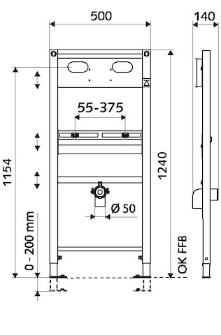 für Ständerwand- oder Vorwandmontage, selbsttragender, pulverbeschichteter Profil-Stahlrahmen mit höhenverstellbaren Füßen und Traversen, vorbereitet zur Aufnahme von Unterputz-Masterboxen (Waschtisch), mit Waschtisch-Modul, Traverse für Waschtisch-Befestigung 40-375 mm, höhenverstellbar, Traverse mit Ablaufbogen und Baustopfen, höhenverstellbar, Traverse für Masterbox, höhenverstellbar, höhenverstellbare Montagefüße 0-20 cm, Befestigungsmaterial für Waschtischmontage (Befestigungsbolzen M 12 x 110 mm, Schutzschlauch, Muttern, Unterlegscheiben, Abdeckkappen), Befestigungsmaterial für Montagefüße, Rahmen Stahl, Oberfläche Rahmen pulverbeschichtet, B 50 cm x H 124 cm, Anschluss Abwasser Ø 50 mm, Abgang Abwasser Ø 50/40 mm (durch Ablängen)